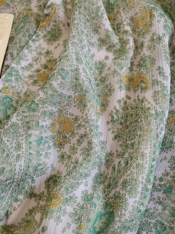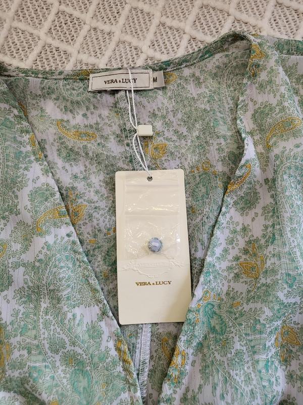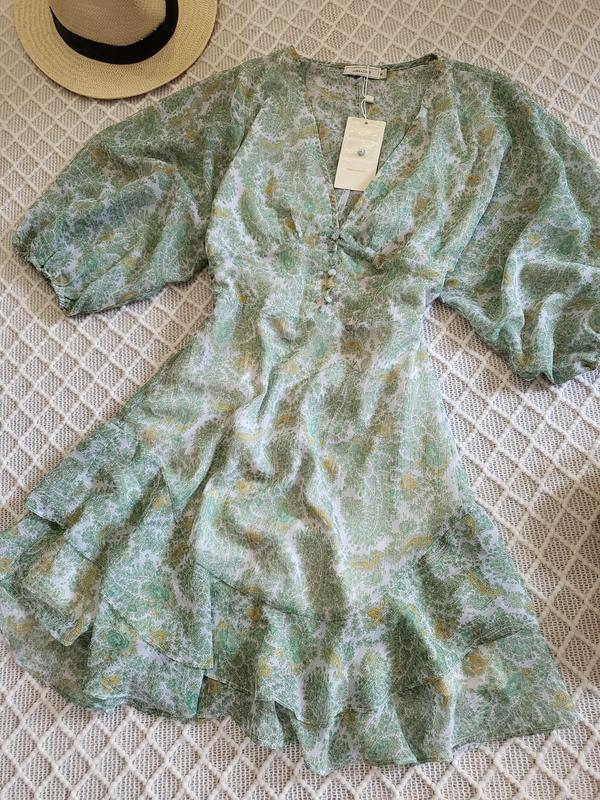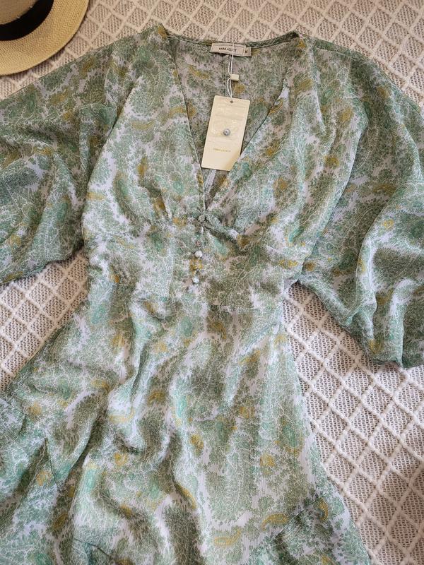 Платье с объёмным рукавом и кокеткой на талии. Нежная пастэльная расцветка.Р. S-MДлина по центру 88смГрудь до 45смТалия 35смБедра 47см