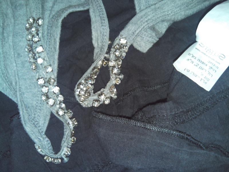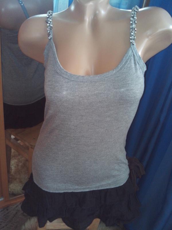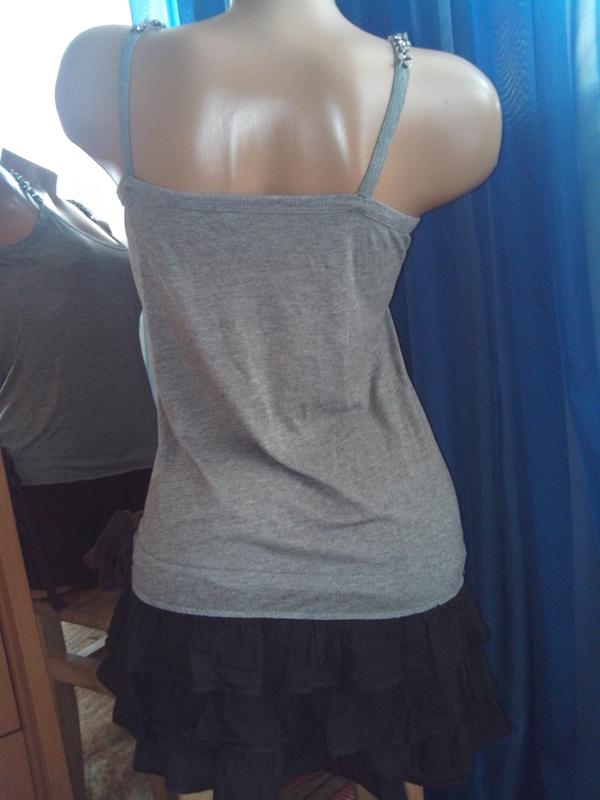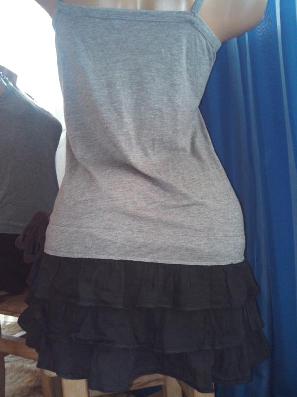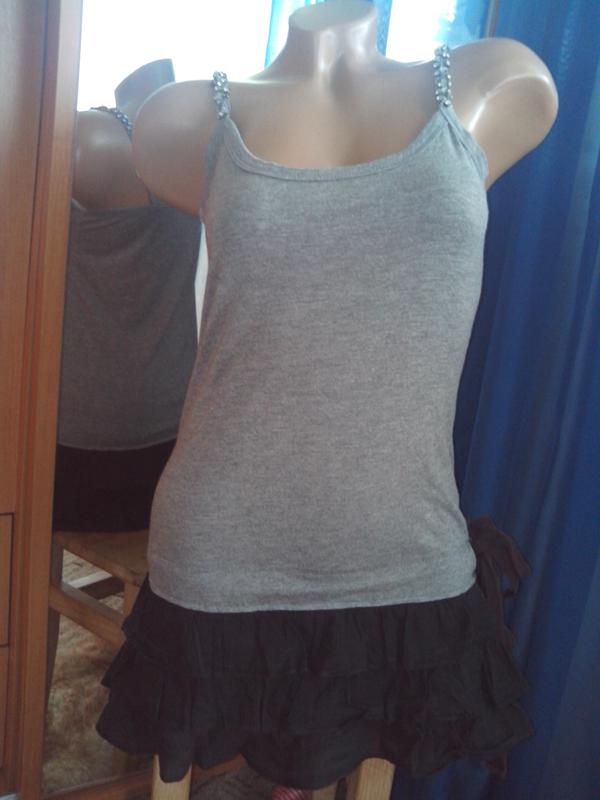 Классная, реально оочень стильная и оригинальная туника, цвета меланж на тоненьких не регулируемых бретелях, украшенных камушками-стразиками и бисером, а внизу - три яруса кокетливых чёрных рюшей-воланов, на бедре сбоку стягивается шнурочком ( можно сделать свободно, а можно подчеркнуть фигурку ). Смотрится оочень интересно и стильно!