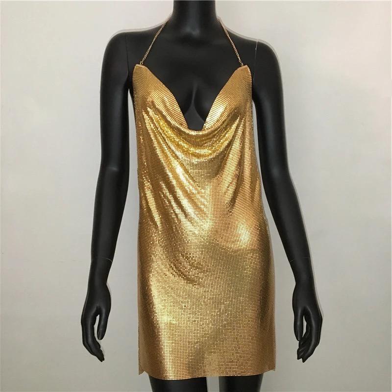 Сукня-кольчуга в золотому кольорі З металевої кольчуги Розмір: S,M Колір: золото Регулюється довжина бретель, застібається ззаду на шиї. Нове, якість люкс🔥