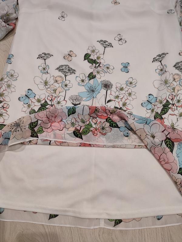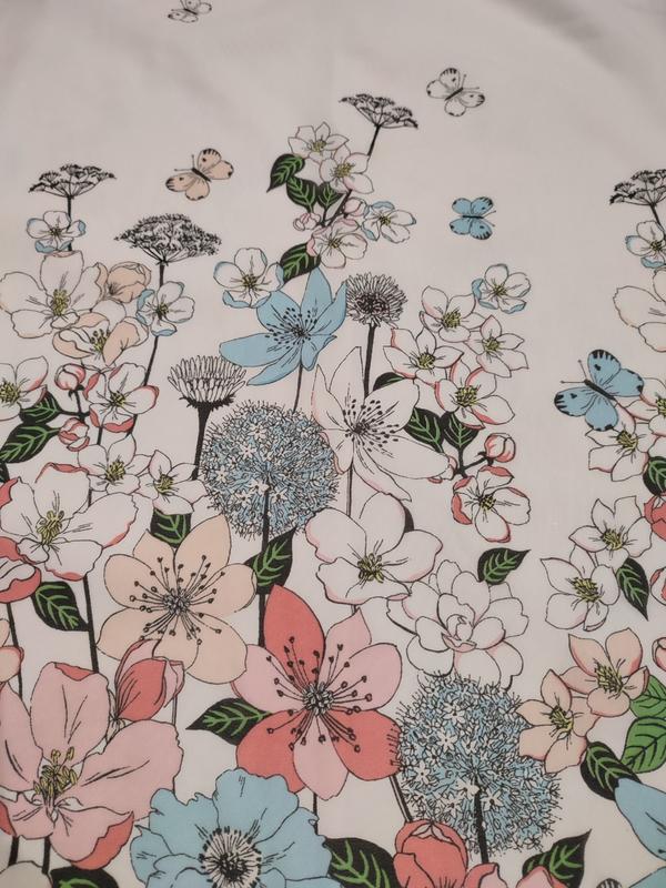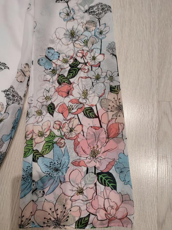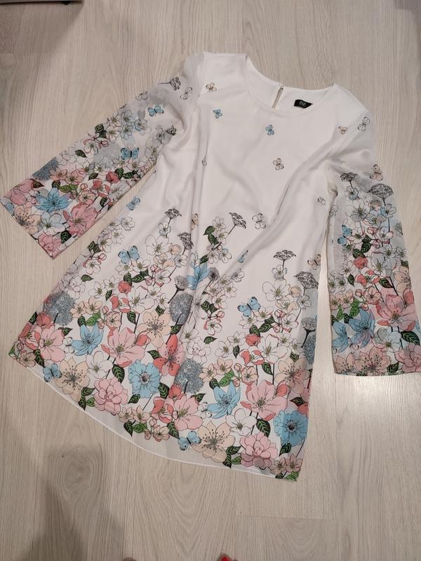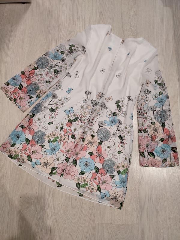 Красивое нежное платье молочного цвета в цветочный принт. Стан идеален, близок к новому.Замеры:длина 77 см,ПОГ 46 см,плечи 36 см,рукав от плечевого шва 58 см,рукав от горловины 66 см.