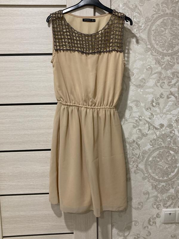 Нежное легкое платье персикового цвета, на подкладке, со вставкой из тоненьких бусинок в области декольте, талия-на резинке. Длина по спинке-87 см, расстояние между подмышками-46 см, 38-40р.
