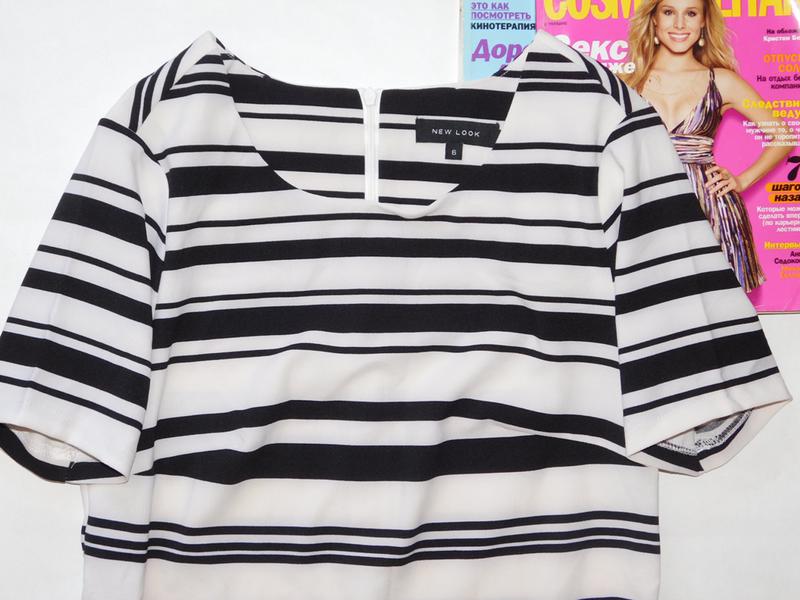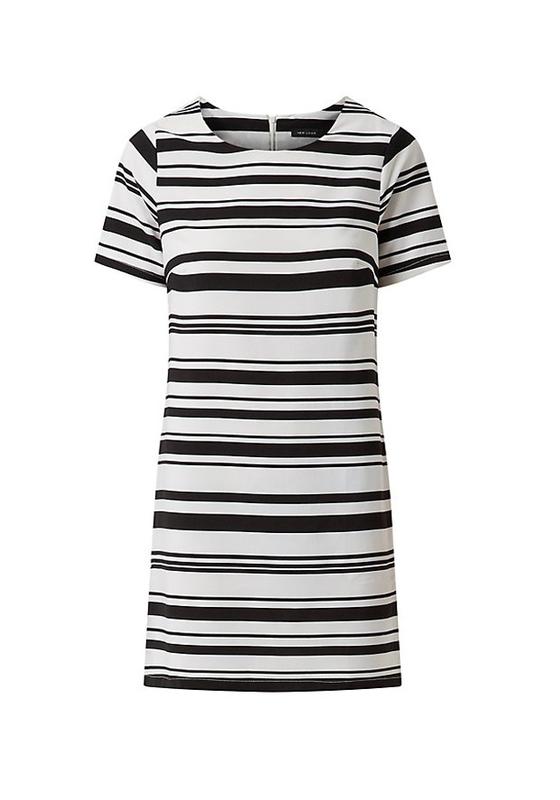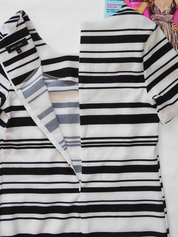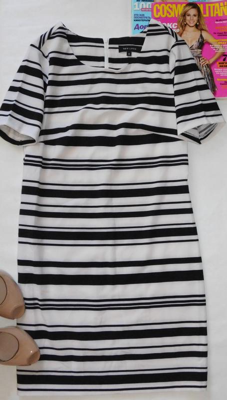 Состав:91% полиэстер 9% эластанПлатье в черно-белую полоску с коротким рукавчиком.