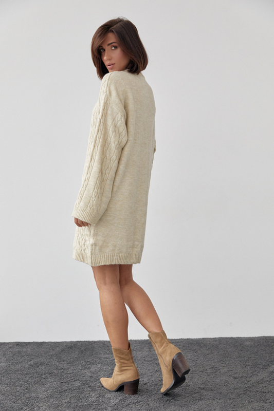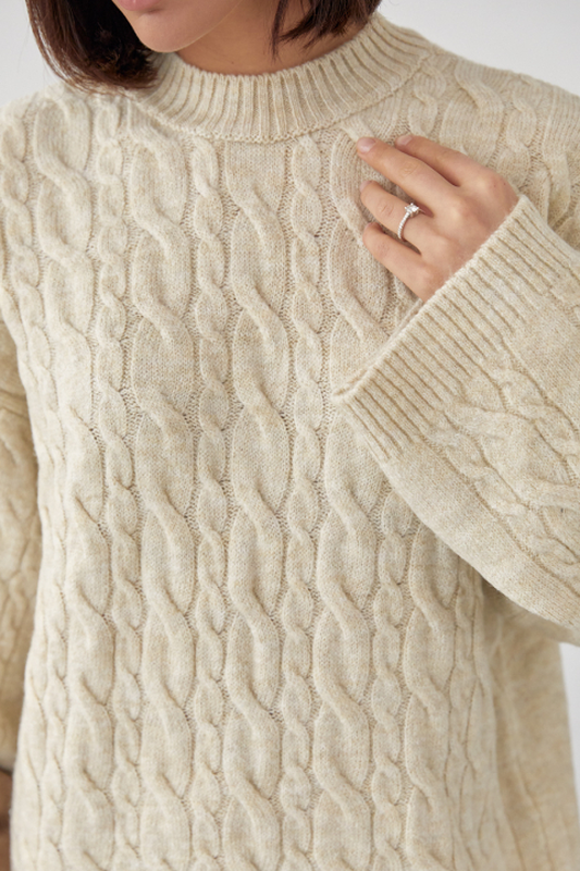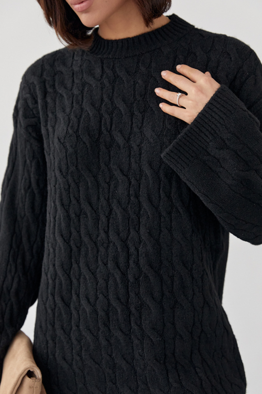 Прямой низ и длинные рукава завершаются вязкой в виде манжеты, а уникальный узор из косичек украшает основную часть изделия и рукава по центру. Круглая горловина дополнена окантовкой в рубчик, придавая образу завершенность и стиль.
