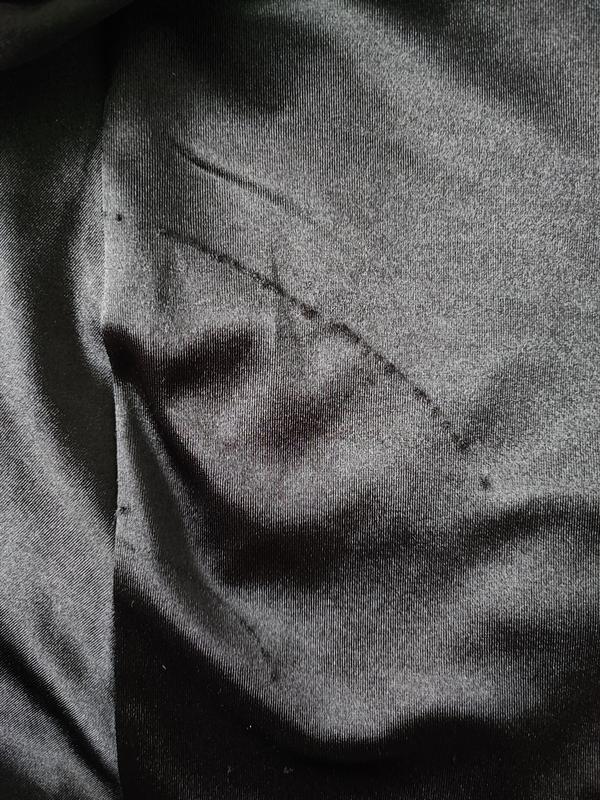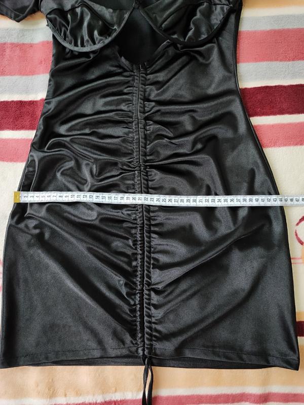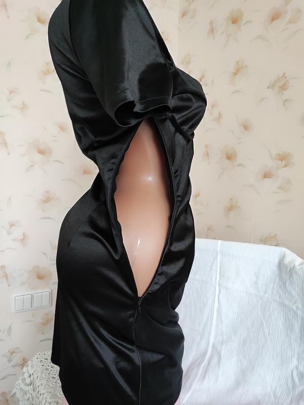 Коктейльное атласное облегающее платье черного цвета. Спереди драпировано на шнурок, скрывает все недостатки фигуры. Сбоку на замке. Глубокий вырез декольте. Под бюстом каркасные косточки, что позволяет поддерживать идеально грудь. В плечах 40 см. Короткий рукав, длина от плеча 18 см. Смотрится потрясающе, очень стильно и эффектно. Отлично садится по фигуре. Ткань плотная, не просвечивает. Есть ньюанс, показала на последних фото (в цене учтено). За счёт того, что ткань переливается, незаметно.