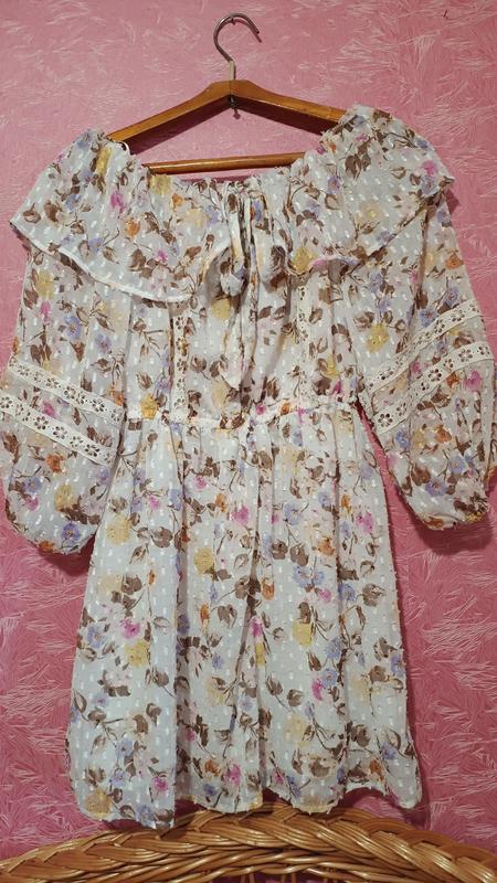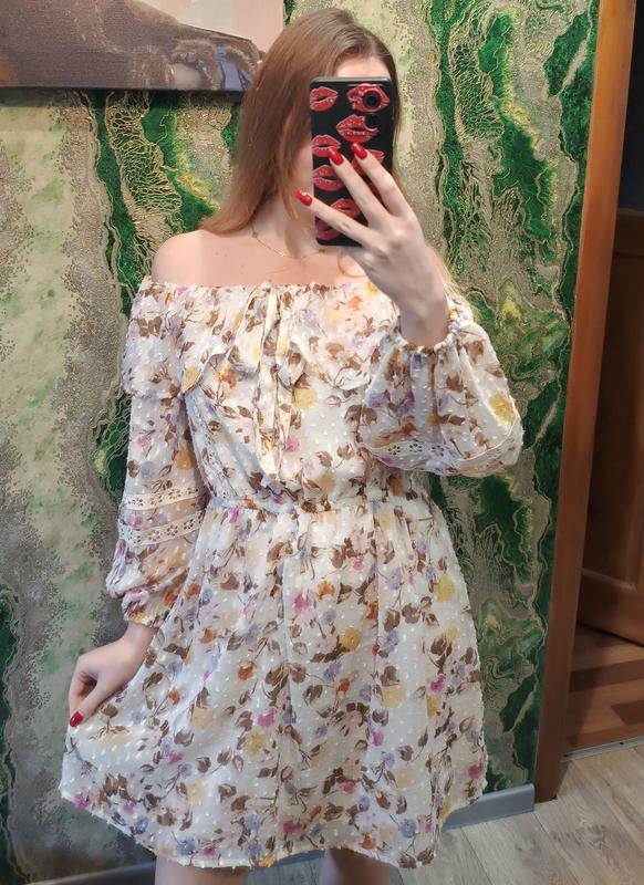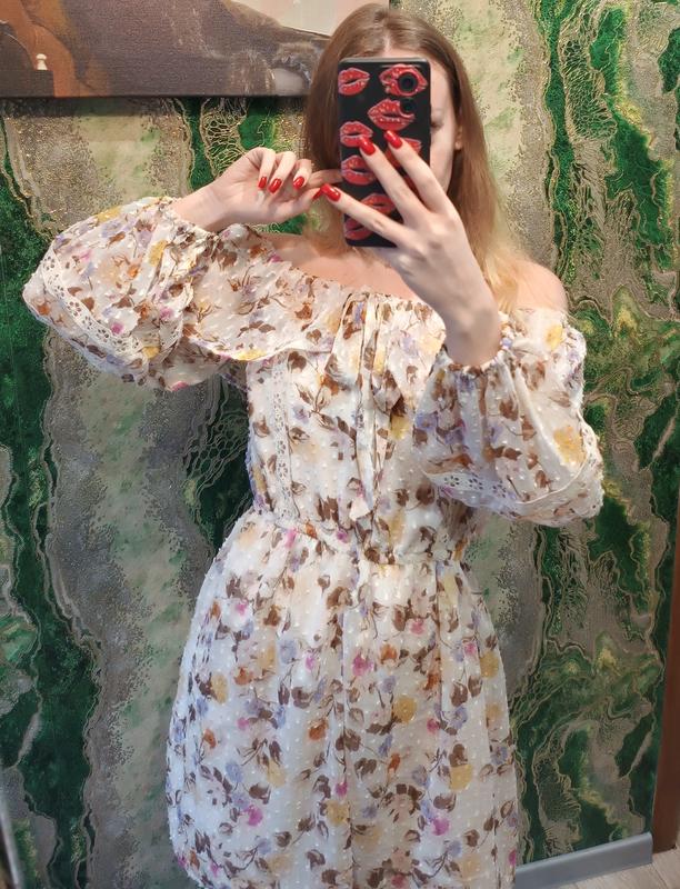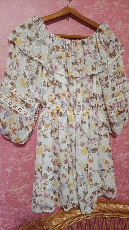 Летнее шифоновое платье с пышными рукавами, открытые плечи принтованное цветами р 40