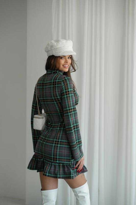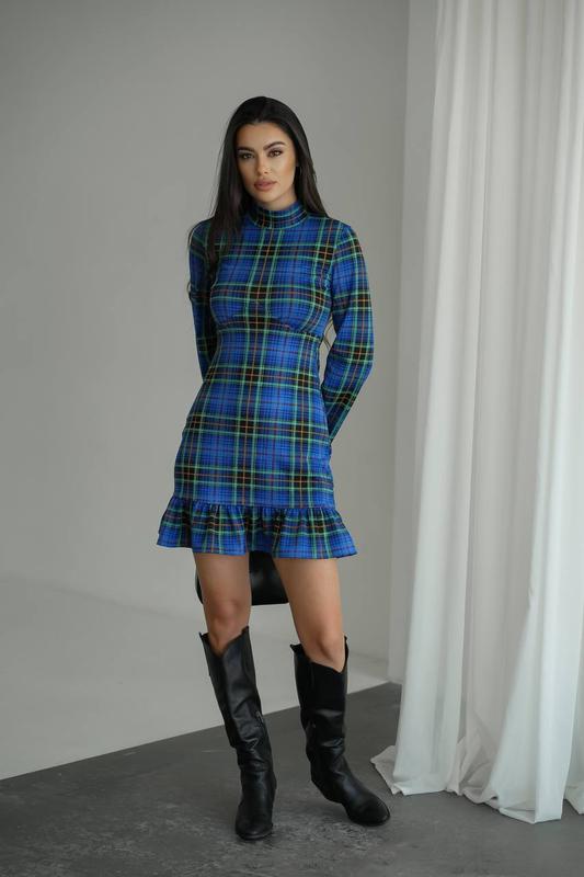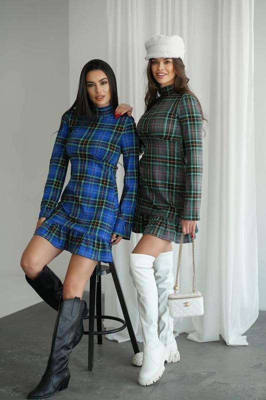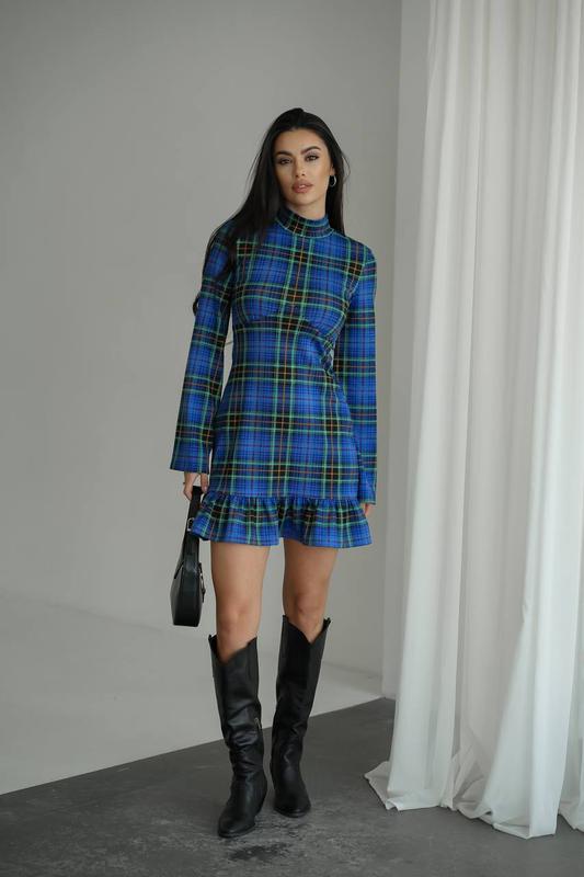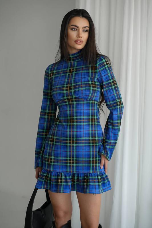 Стильное яркое платье для девушек в модную клетку из французского трикотажа, с длинными рукавами клеш и воланом.