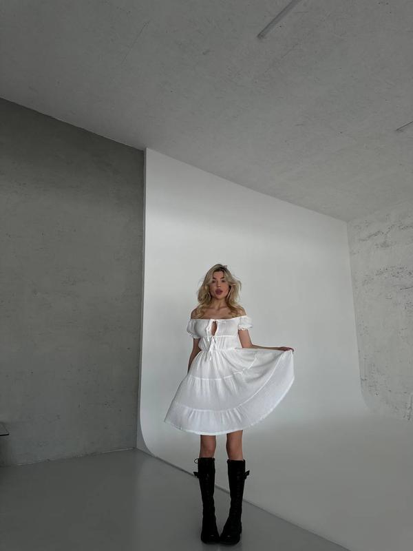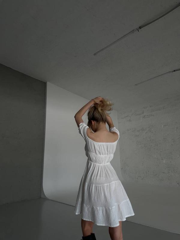Невагома сукня, яка стане Вашою супутницею цього літа. Легка та приємна до тіла. На поясі та рукавах резинка, на грудях регулюється куліскою.