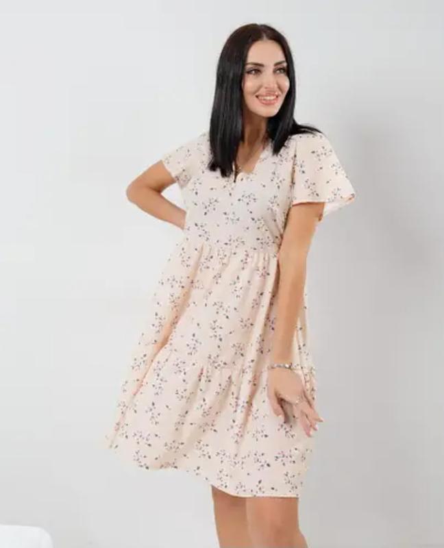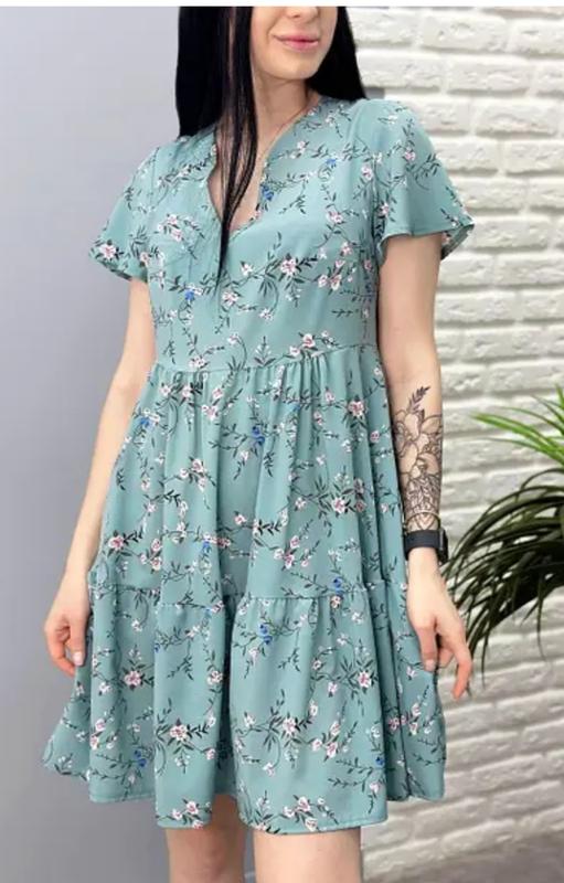 Короткое платье с цветочным принтом из софта.Полувольная модель, небольшое декольте.Широкая оборка. Цвет: голубой, фисташковый.