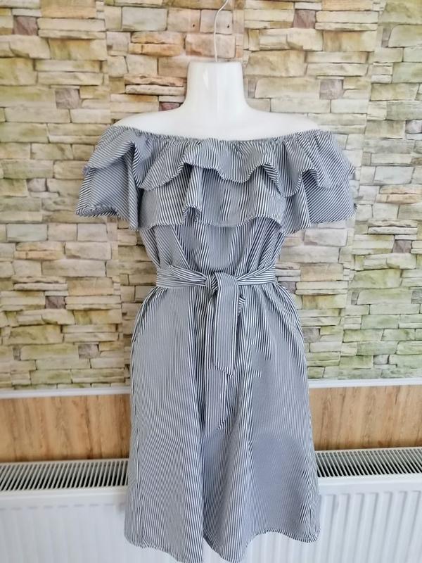 Летнее легкое платье туника сарафан в полоску с воланами открытые плечи с пояском