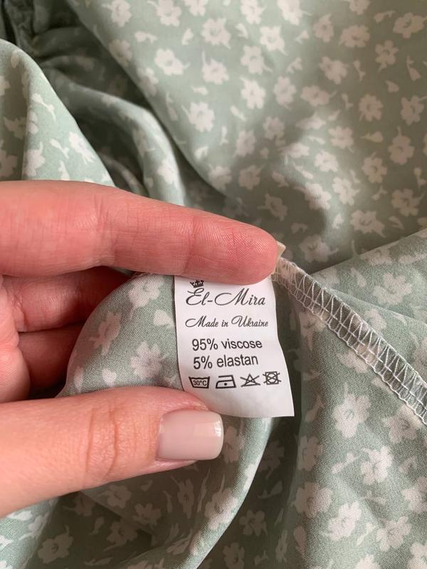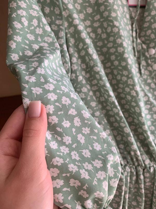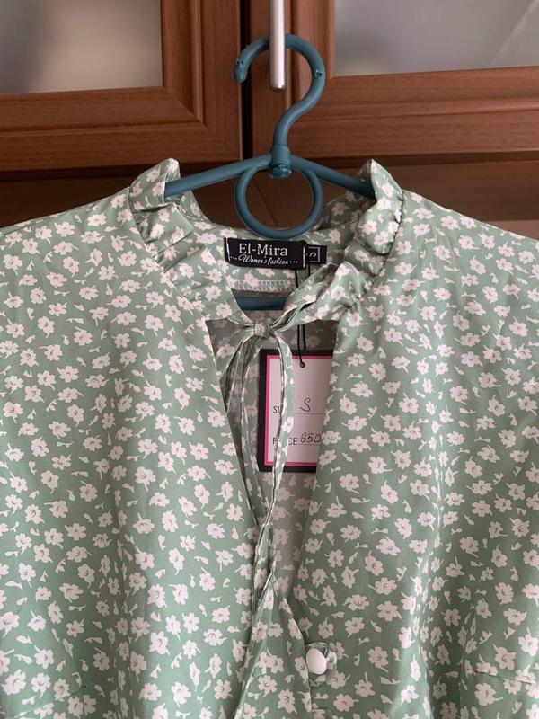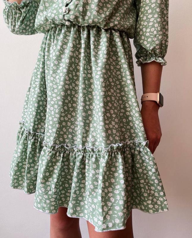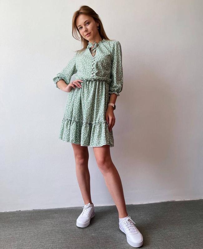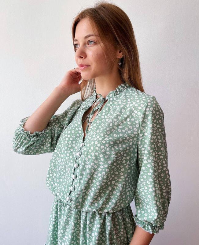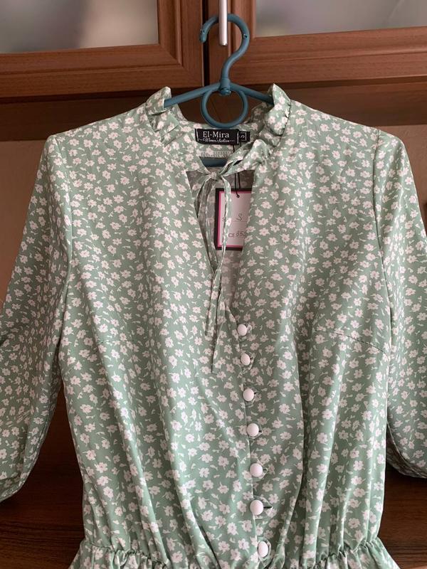 Платье приятного мятного цвета с мелкими белыми цветами. Рукава 3/4, на резинке. На талии также есть резинка. От талии до груди есть декоративные пуговицы белого цвета. На шее лента, которую можно завязать на бант.