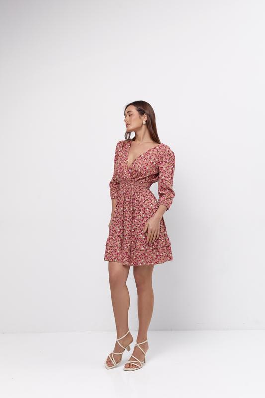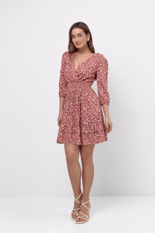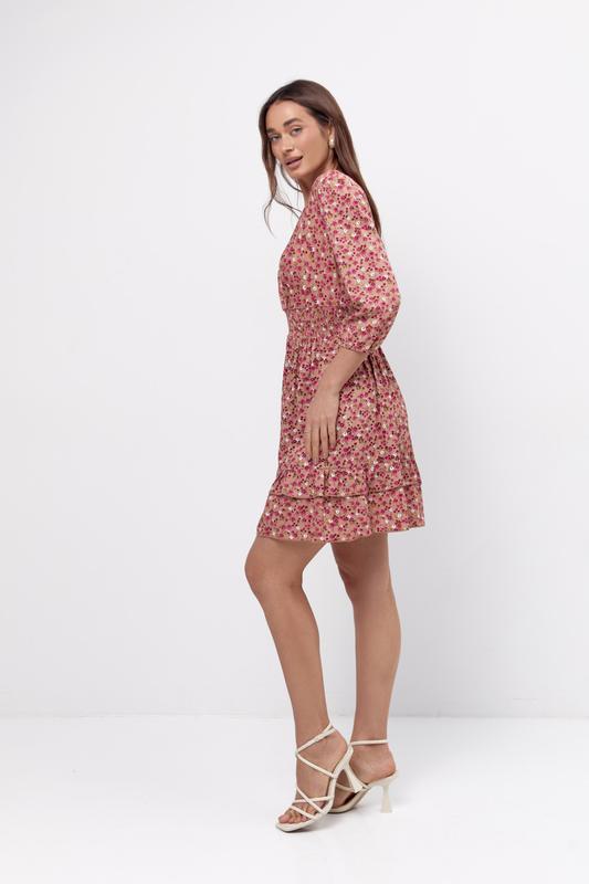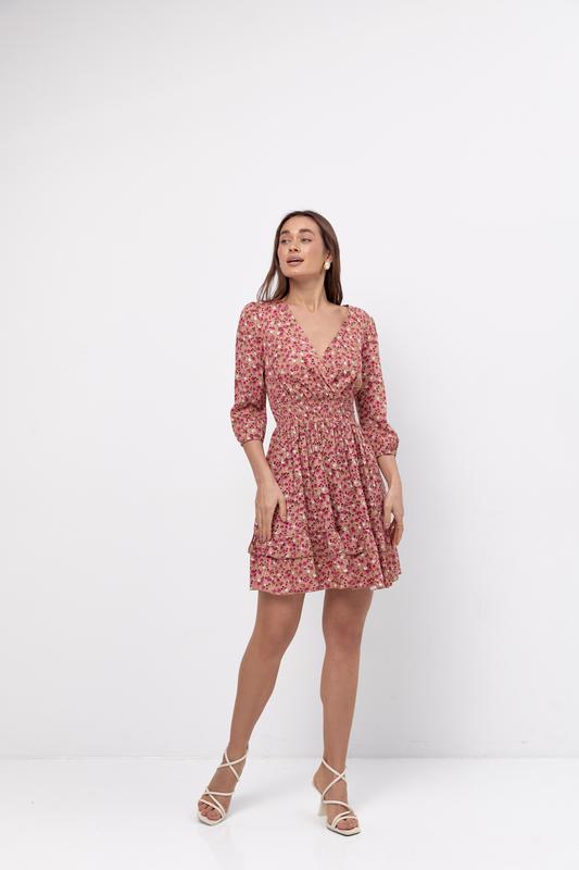 Легкое летнее платье длиной мини с лифом на затин. На талии платье собрано поясом с резинкой, юбка по низу с оборками. Рукава втачные, длина 3/4, по глазу рукава сборка, низ рукава собран резинкой