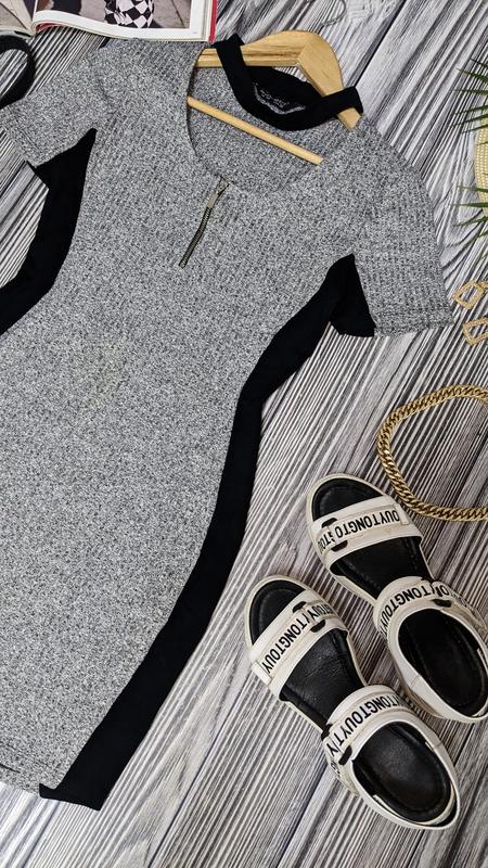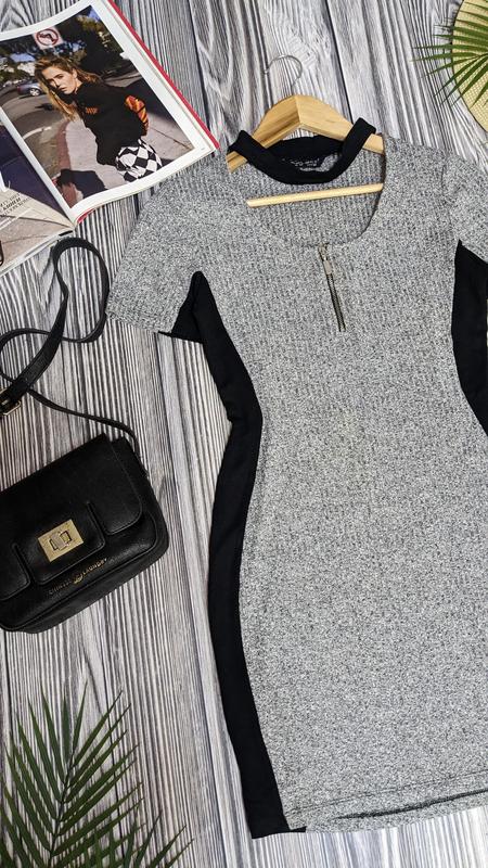 Трендова сукня в рубчик з чокером. Кругле не глибоке декольте, нижче застібається на металеву блискавку. Рукав короткий, не широкий. Чокер та боки з чорної гладкої трикотажної тканини. Суцільна, не відрізна, приталена. Сідає по фігурі. Сукня з тонкої трикотажної комбінованої тканини. Дуже м'яка та приємна до тіла. Гарно тягнеться, не просвічується, не колеться.