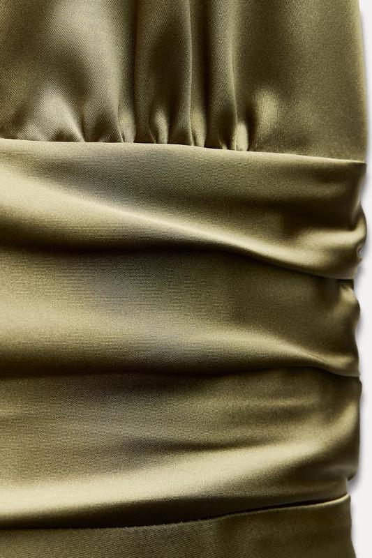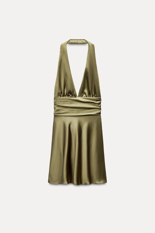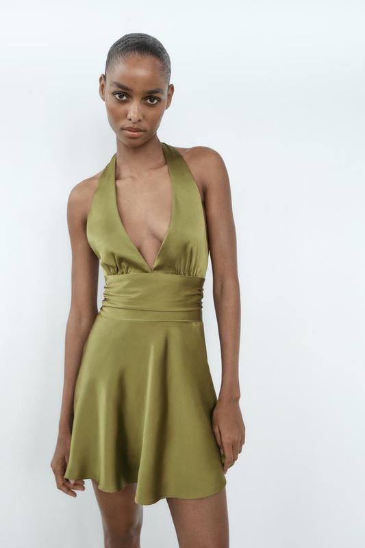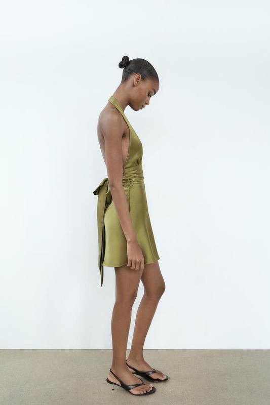 Короткое платье с глубоким V-образным вырезом и открытой спиной. Застегивается на скрытую молнию сбоку. Завязки сзади и подкладка в тон.
