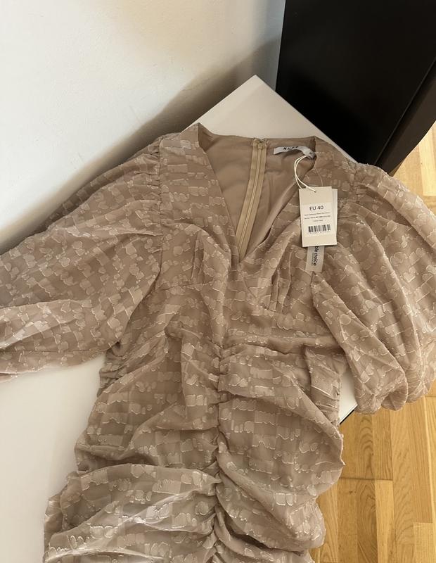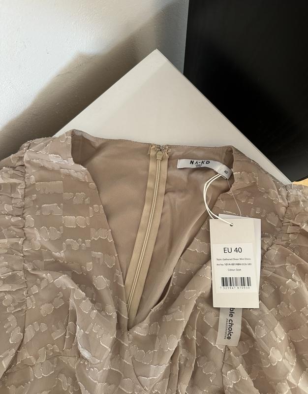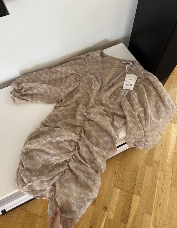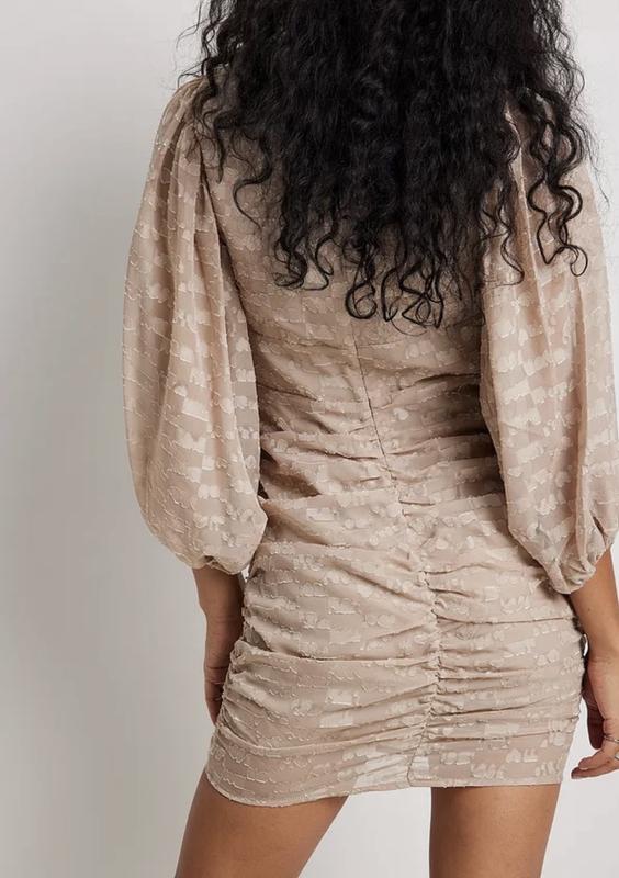 Платье имеет пышный рукав длиной три четверти с эластичным подолом, V-образный вырез со сборной мягкой чашкой, молнию сзади, собранные швы и прозрачный, узорчатый материал с подкладкой.