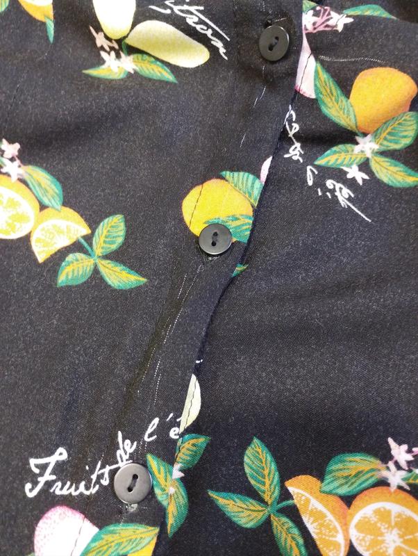 Очень красивый, сочный узор)Как бы есть несколько затяжек, но я не уверена, что то такое, возможно, недостаток на ткани.На уровне живота по линии пуговиц зашила, чтобы ткань не разходила.