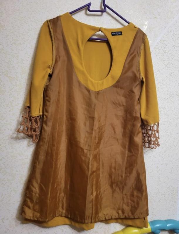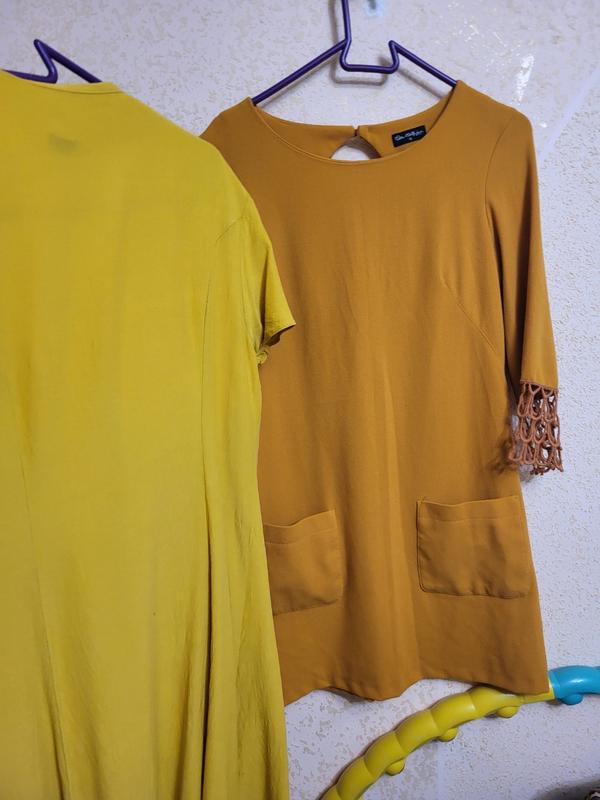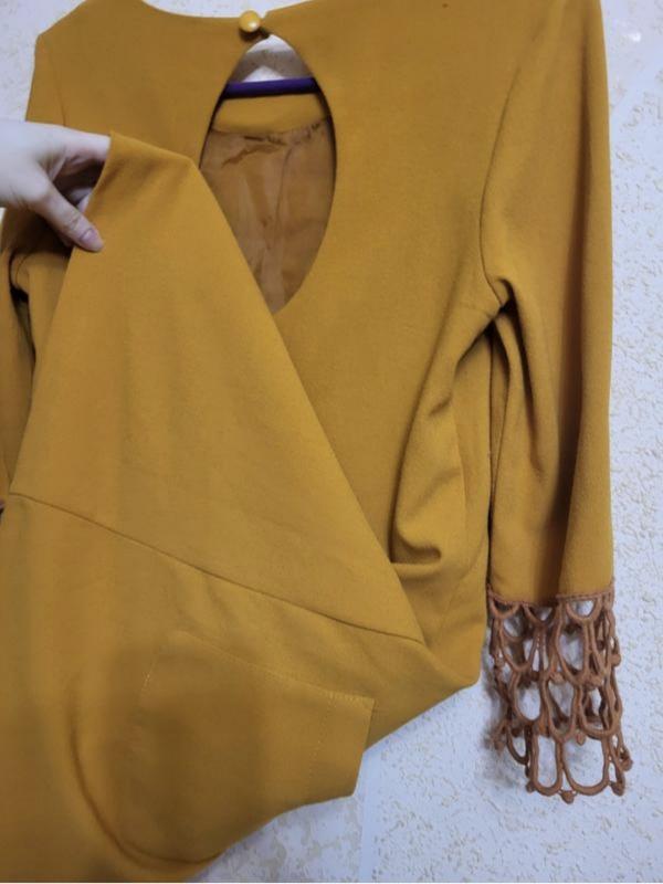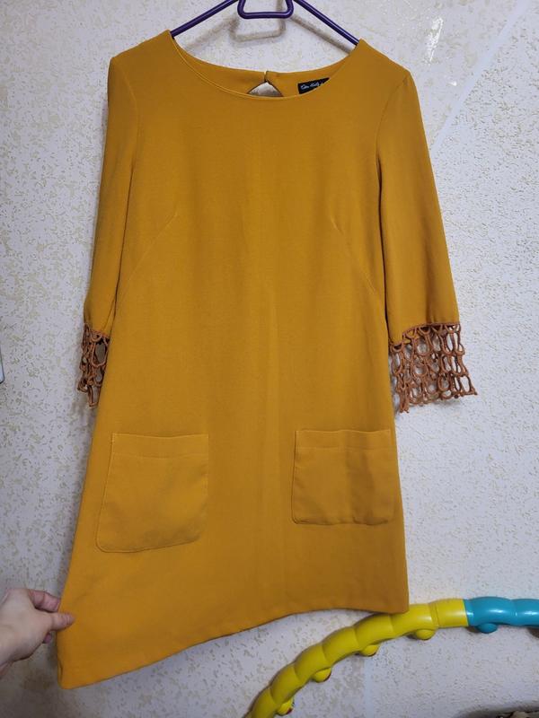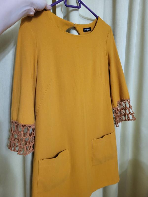 Горчичное платье с ажурными рукавами мини платье трапеция платье с карманами с-м