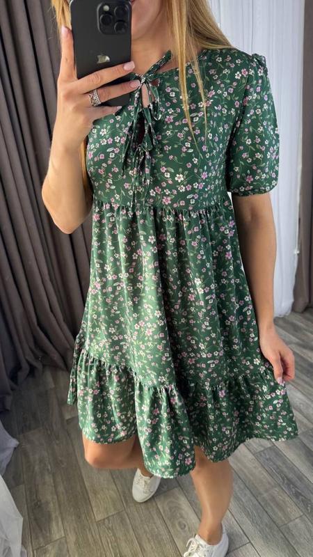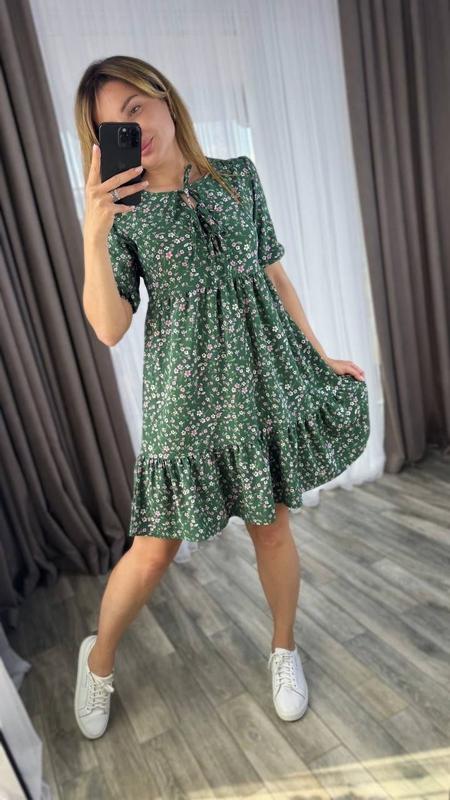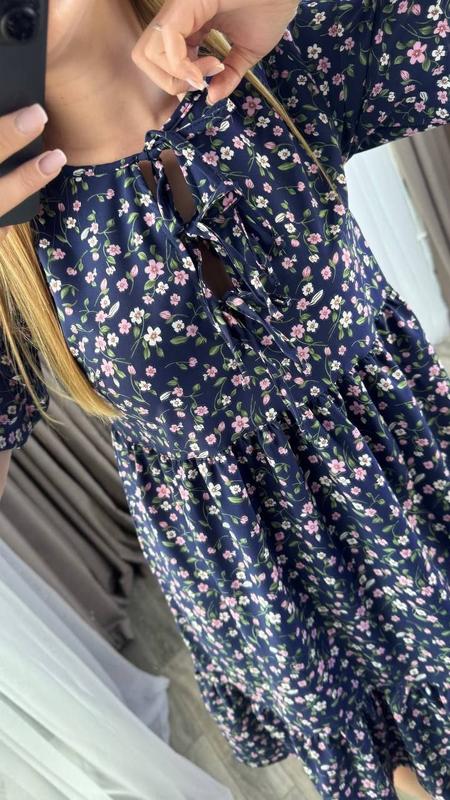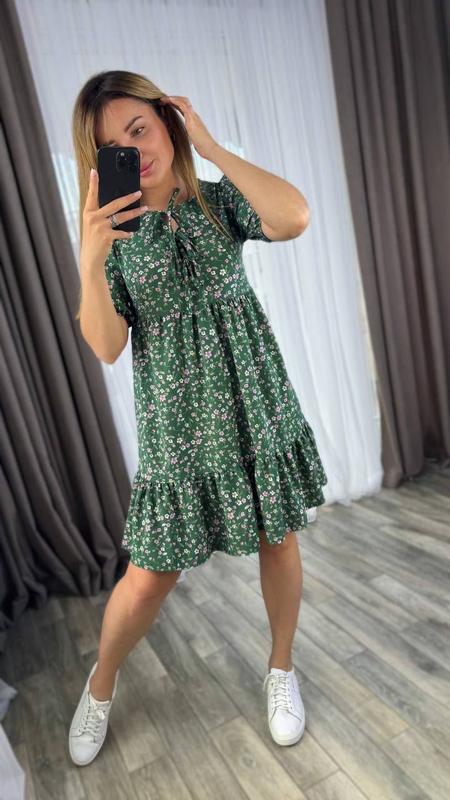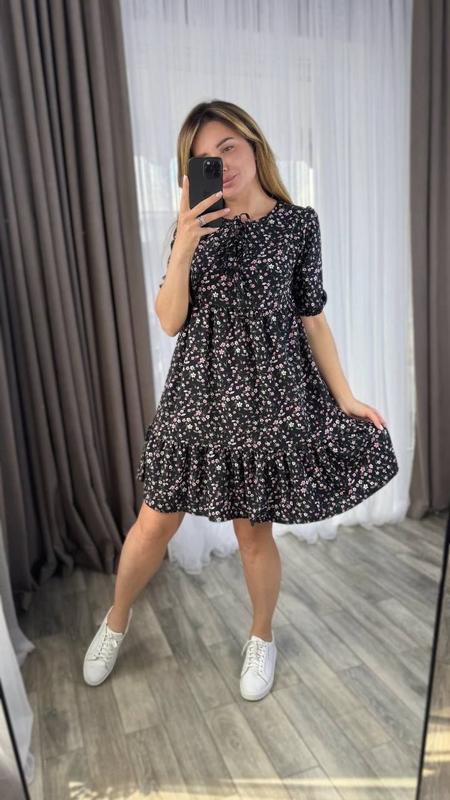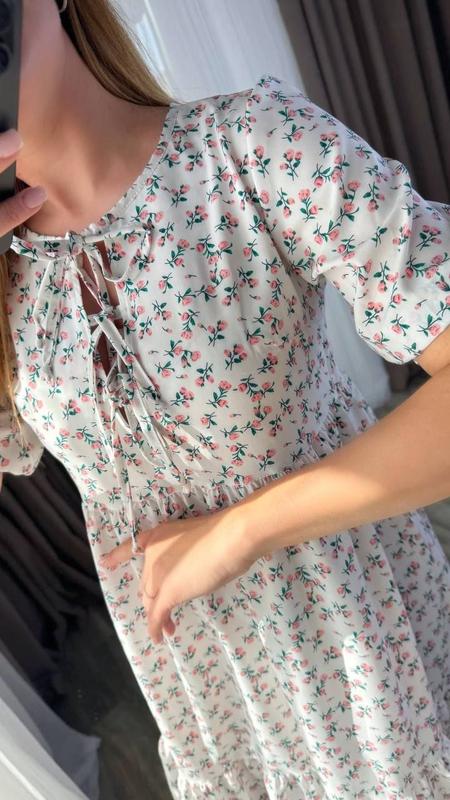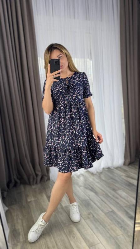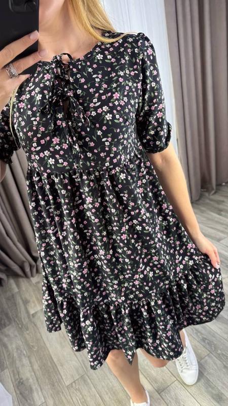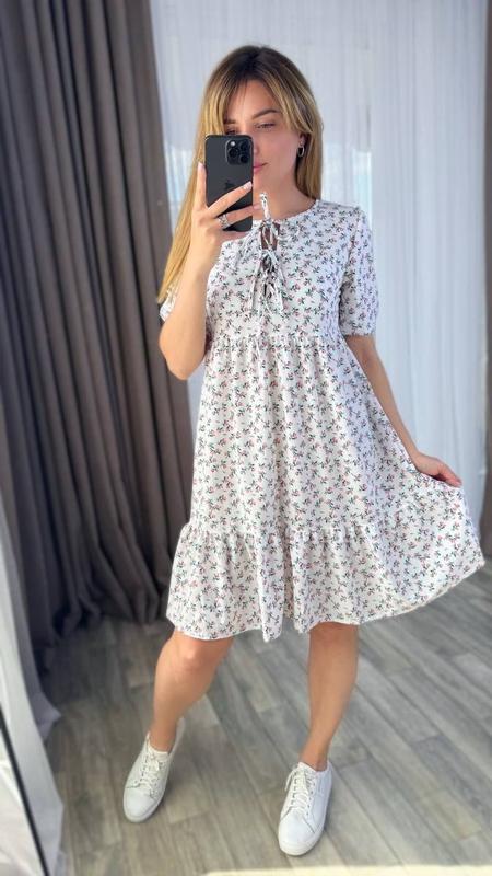 Платье свободного кроя, рукав на резиночке, на груди завязки