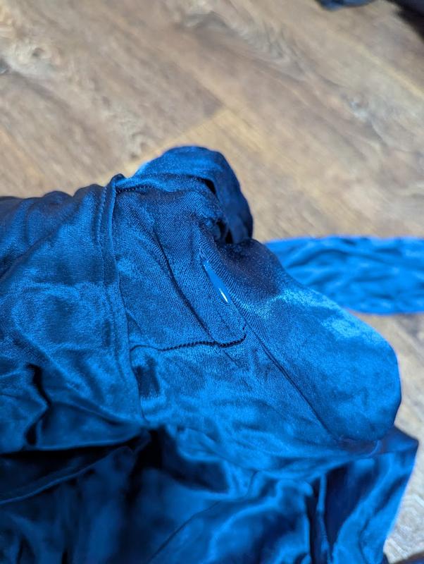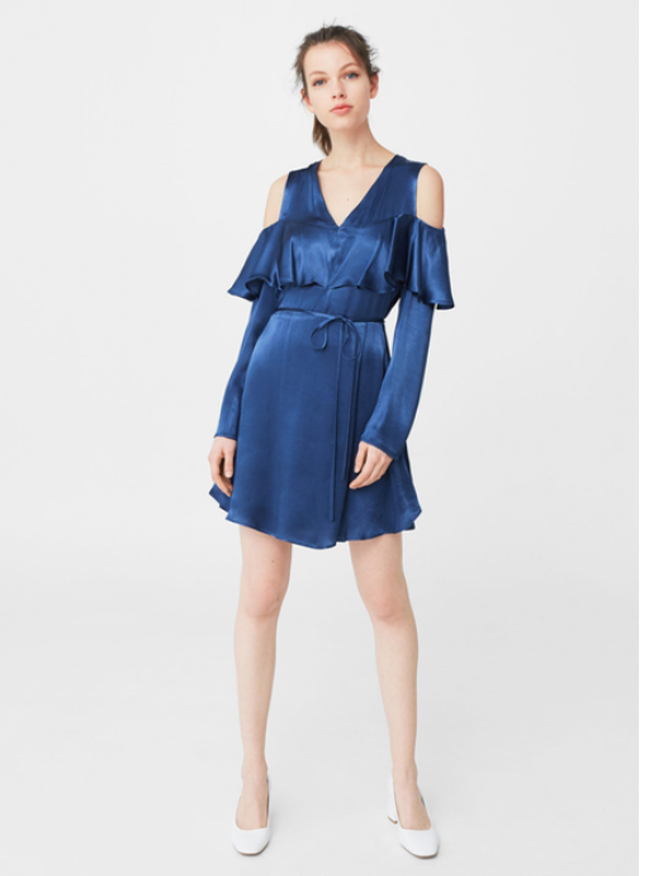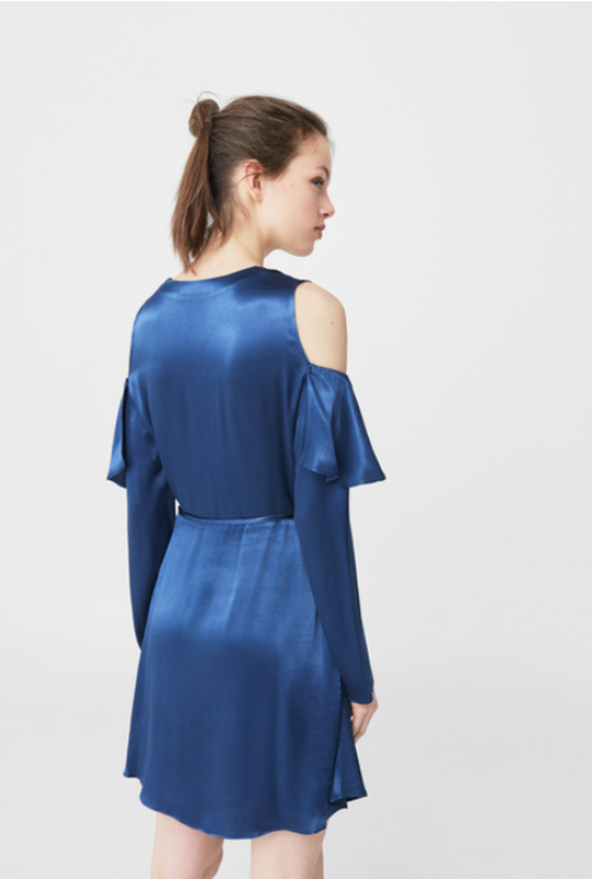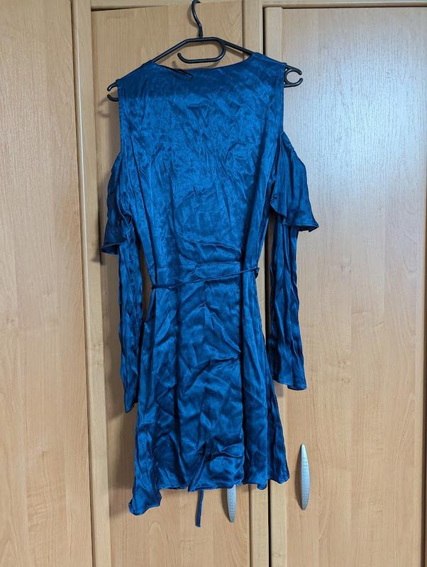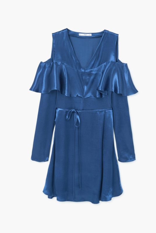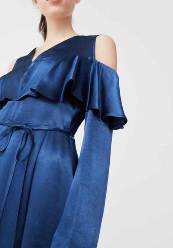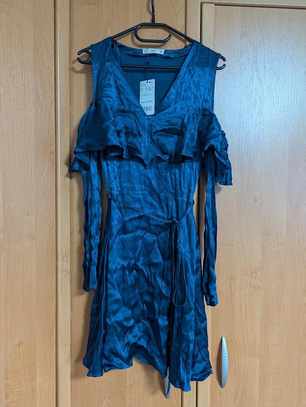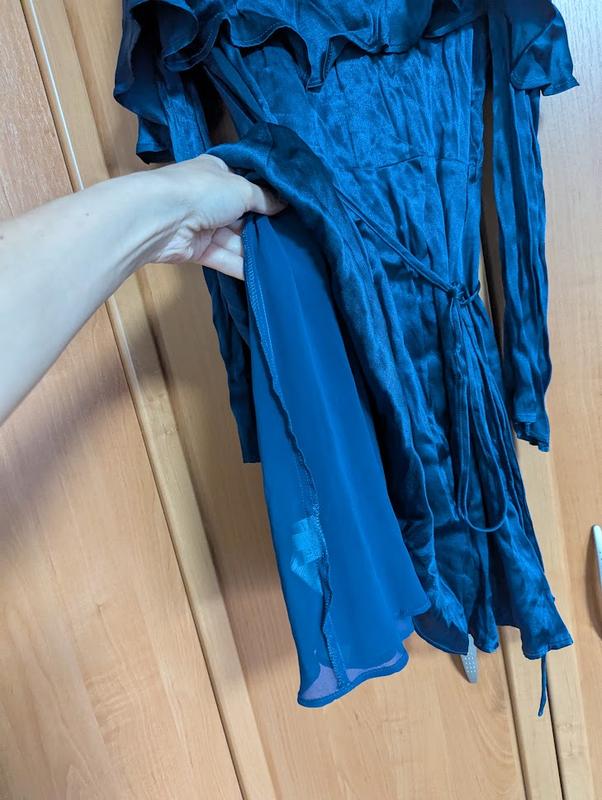 Зверху волан. V-образный вырез горловины. Длинные рукава с разрезами. Приталенный крой. Талия регулируется шнурочком. Сбоку застежка-молния.