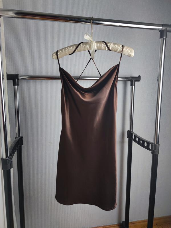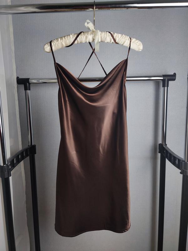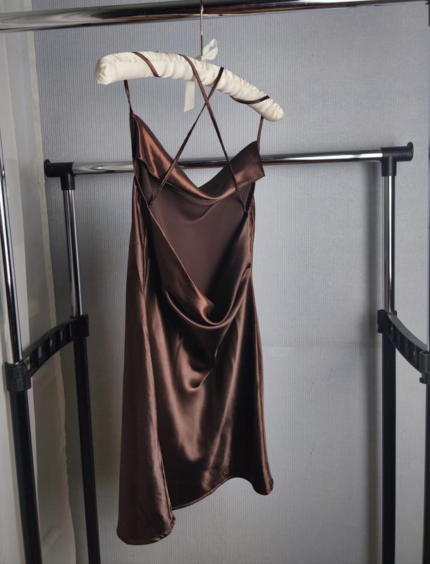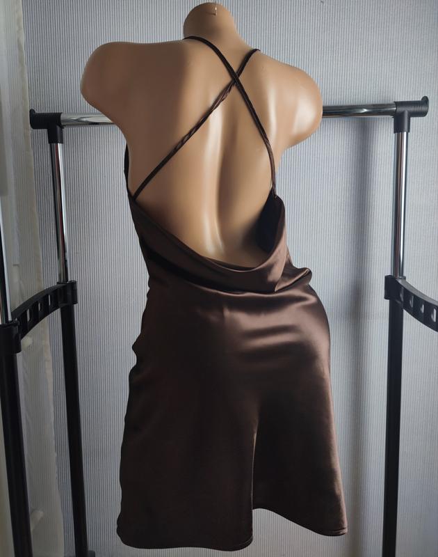 Мини-платье из мягкого атласа с блеском, не просвечивает вырез с драпировкой сверху и узкие бретели, перекрещенные на спине. Глубокий вырез с драпировкой на спинена хс с будет хорошо