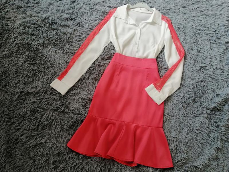 Костюм рубашка с прозрачными кружевными лампасами и юбка колокольчиков высокая посадка из...