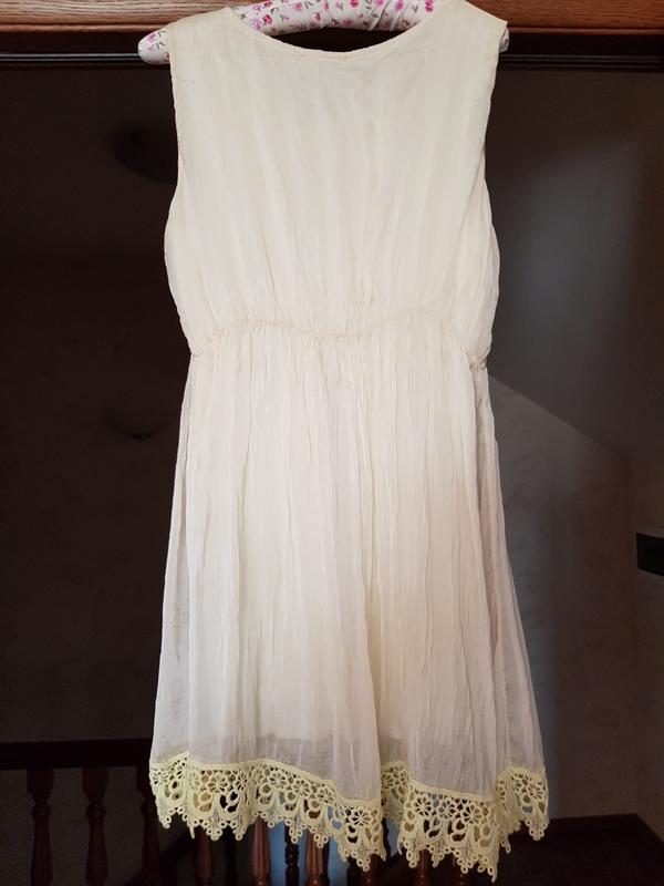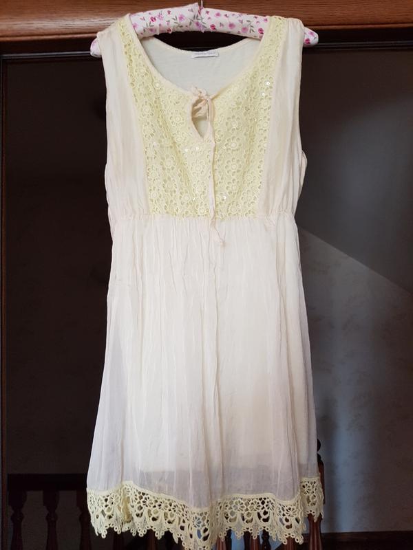 Отличное платье на лето, цвет нежно-желтый. Размер подойдет на S-M, крой достаточно свободный. Кружево в верху расшито бесцветными пайетками Отдам при покупке любой вещи со странички