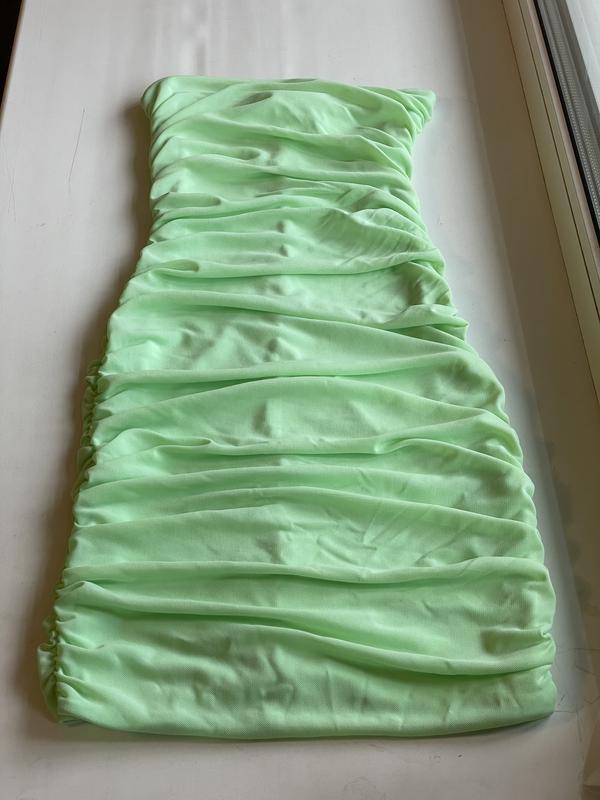 Трикотажное мини платье, мятного цвета. Сверху ткань-сеточка в тон платья. Мягкая драпировка и открытые плечи, создадут вам очень нежный образ🌹
