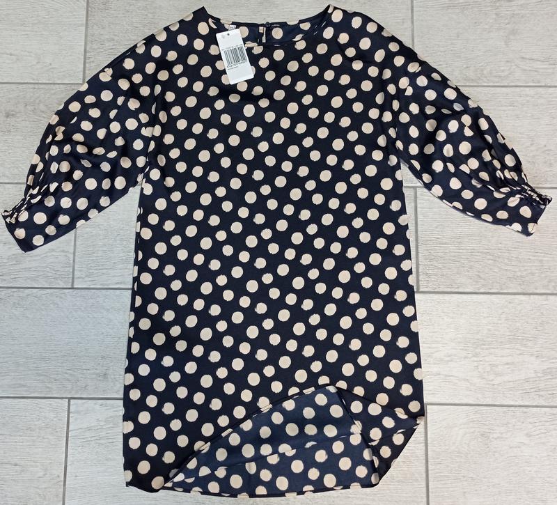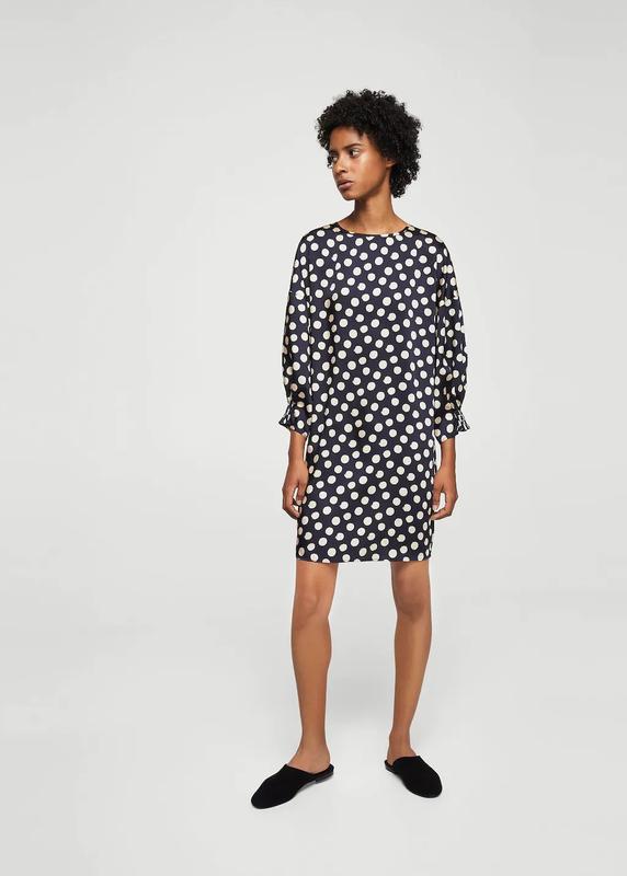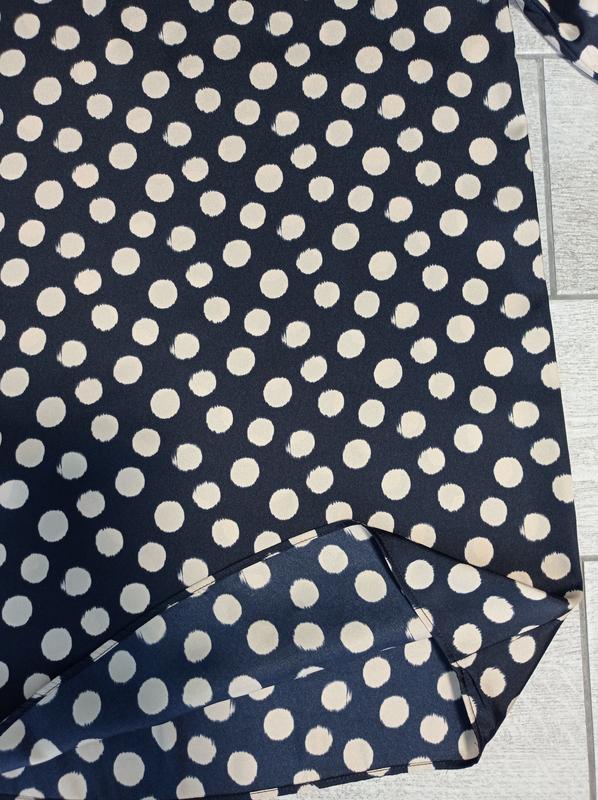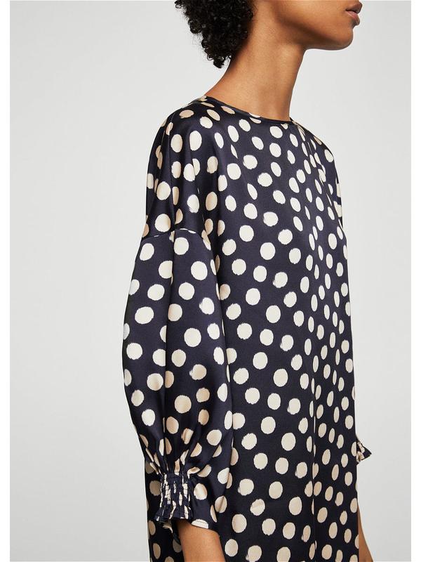 Принт в горошек, на рукавах сборки, сзади застежка на пуговицу.