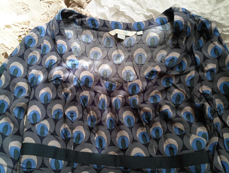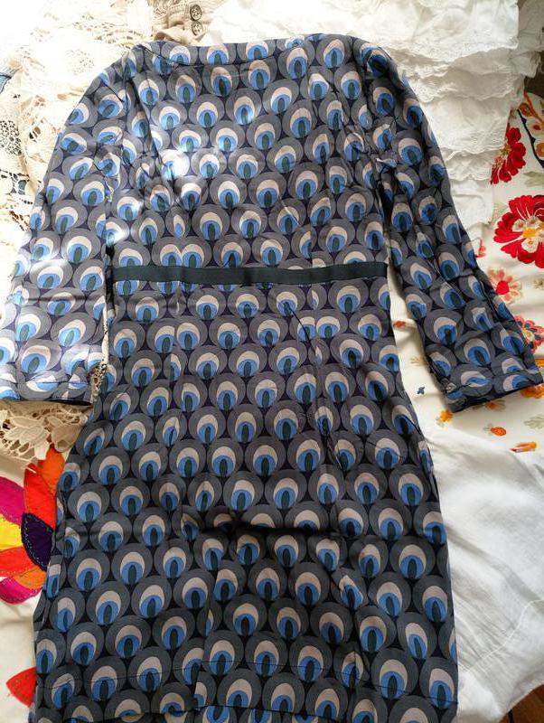 тёмнобирюзовый-серединки "глаз" и лента. Вещь в идеальном состоянии без дырочек, разрывов, полезших ниток, пятен и прочего безобразия. Длина изделия 75 см, длина рукава 42 см, ширина манжеты рукава 12см, от подмышки до подмышки 42см, под грудью "лента" 37см, в раёне бёдер 42 см, молния идёт от подмышки длиной 32см. Не ленитесь брать сантиметровую ленту, мерить то, в чём вам удобно и сравнивать с указанными замерами.