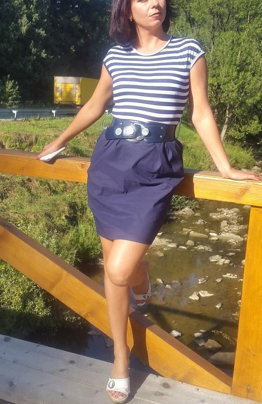 Очень лёгкое платье, морская модная расцветка, не мнется. Ткань тянется. Размер М. Замеры и дополнительно фото вышлю.