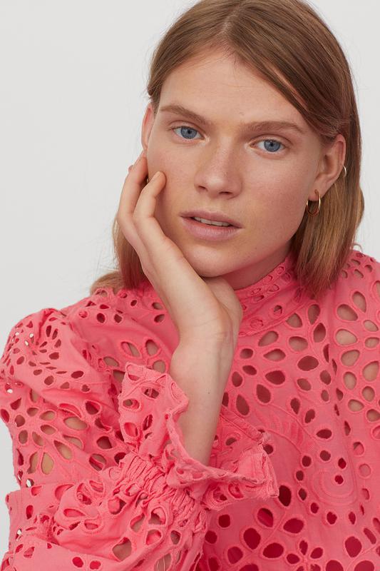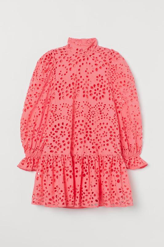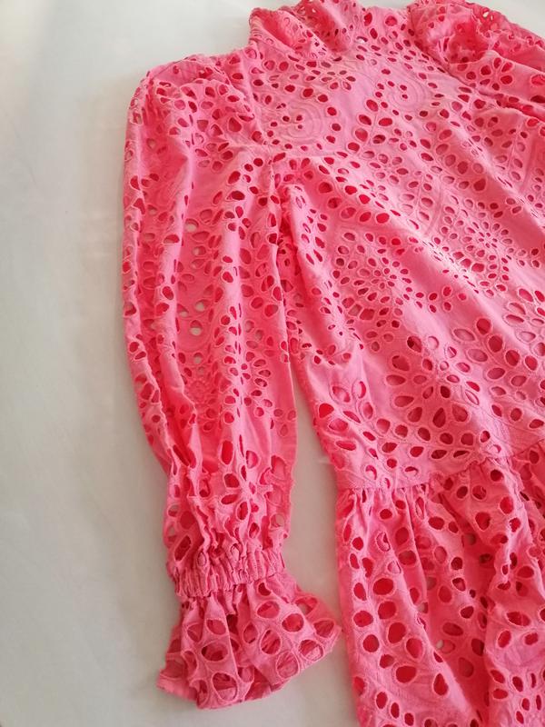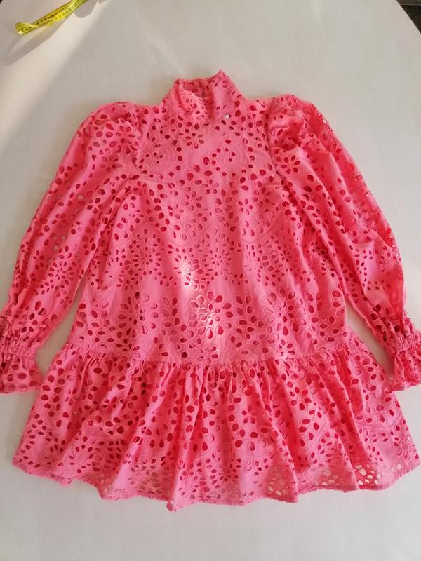 Короткое платье из воздушной хлопковой ткани с английской вышивкой . Высокий воротник-стойка, вырез на пуговице сзади на шее и широкие длинные рукава с узкой резинкой и оборкой на манжетах.