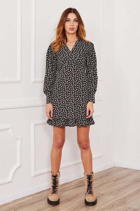 Легкое платье с воланом в цветочный принт- отличная базовая вещь как в повседневный гардероб, так и на торжество. Вырез на запах красиво открывает зону декольте и ключицы. Такое платье хорошо сочетается как с обувью на каблуке, так и кроссовками. Добавив контрастный пояс на талию, не только создается дополнительный акцент, но и женственный силуэт.