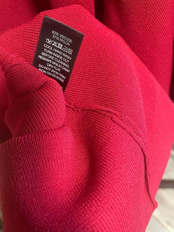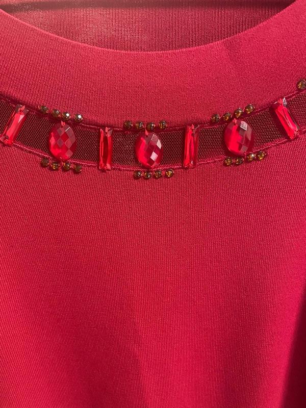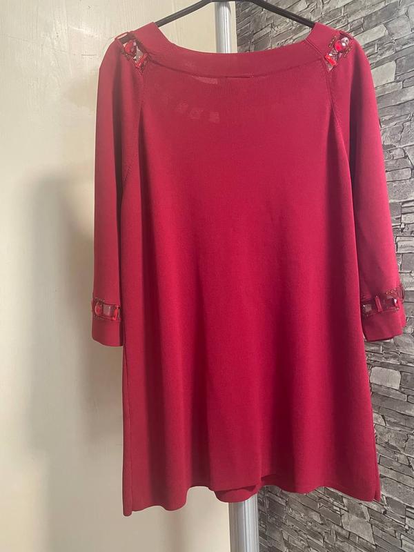 Можно носить как кофту, так и как тунику (для разного роста), красиво держит форму, так как вискоза с нейлоном выглядит очень нарядно. Длина 68см, ПОГ 53см, ПОБ 56см.