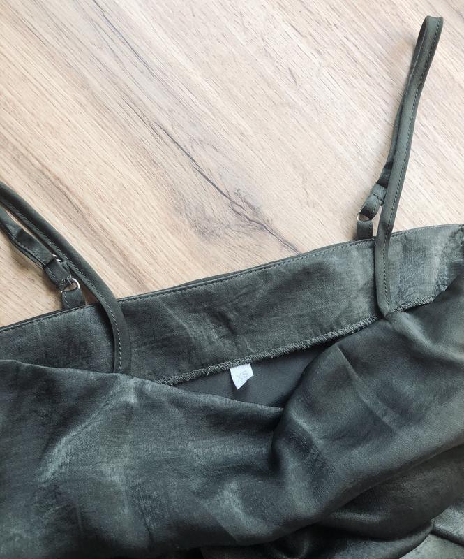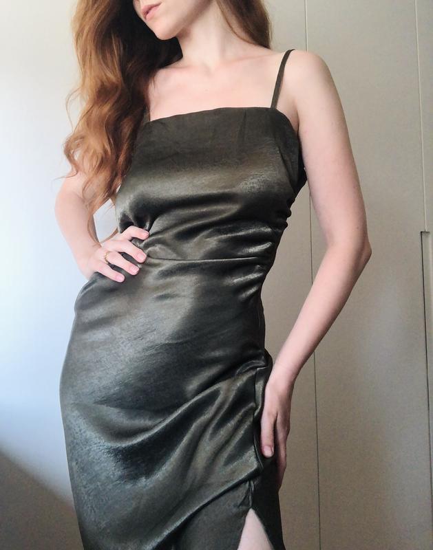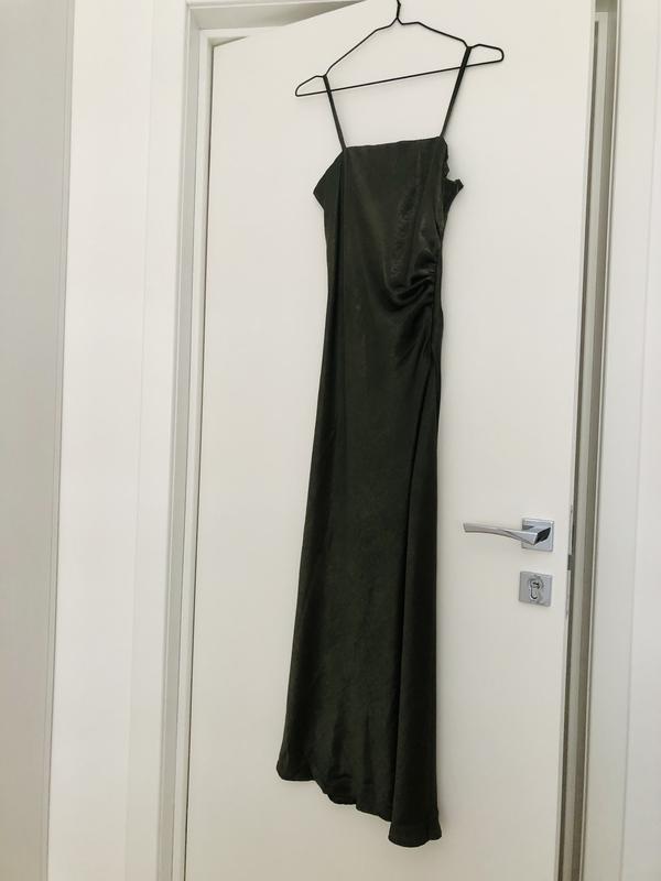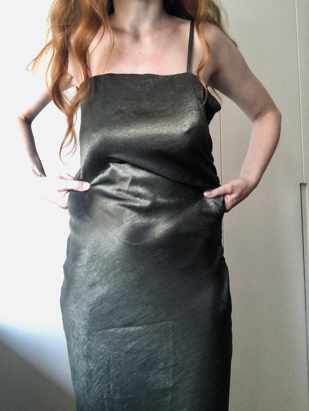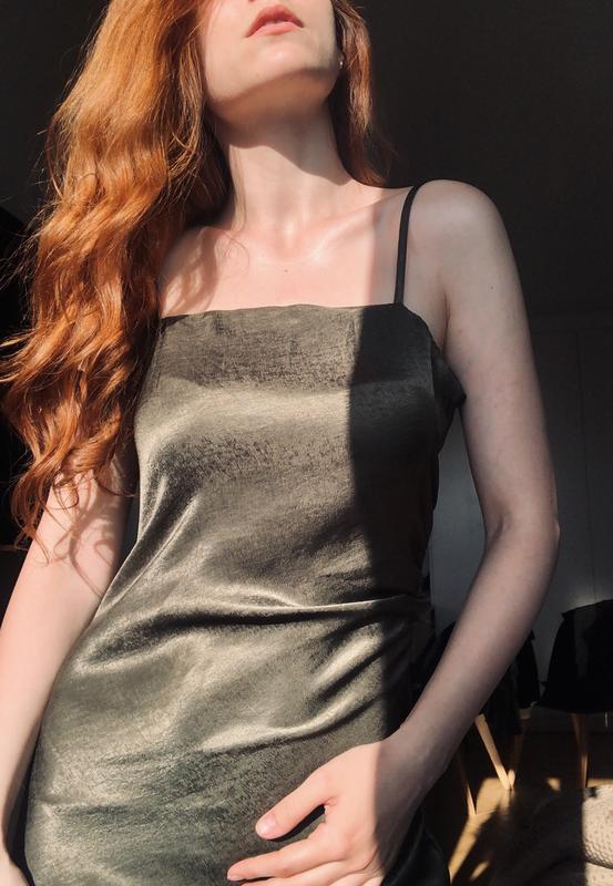 Платье на бретелях с распоркой, сбоку застегивается на замок, на рост 163-до щиколотки, на ярлычке указан размер XS, но по факту это больше S-M, на параметры 83-61-88 широкая и «высотит» в идеальном состоянии, есть маленький нюанс (проколы от иглы) на последнего фото. Цвет прицела- темно-зеленый (гнила трава).