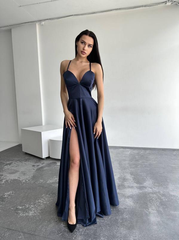 Розкішна сукня максі з розрізом на ніжці 👗 Модель з глибоким декольте та тонкими бретелями, що регулюються, ліф з паралоновими чашками. ☁️Матеріал: королівський атлас ☁️Розмір: S, M, 🎨 т.синій Є відео огляд Х