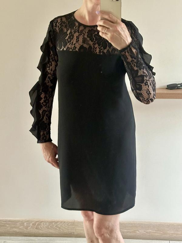 Маленькое черное платье, украшенное кружевом. На спине имеет застежку в виде капли на пуговицу. Так же сделано на рукавах. А также рукав отделан рюшей. На фото одета на размер М.