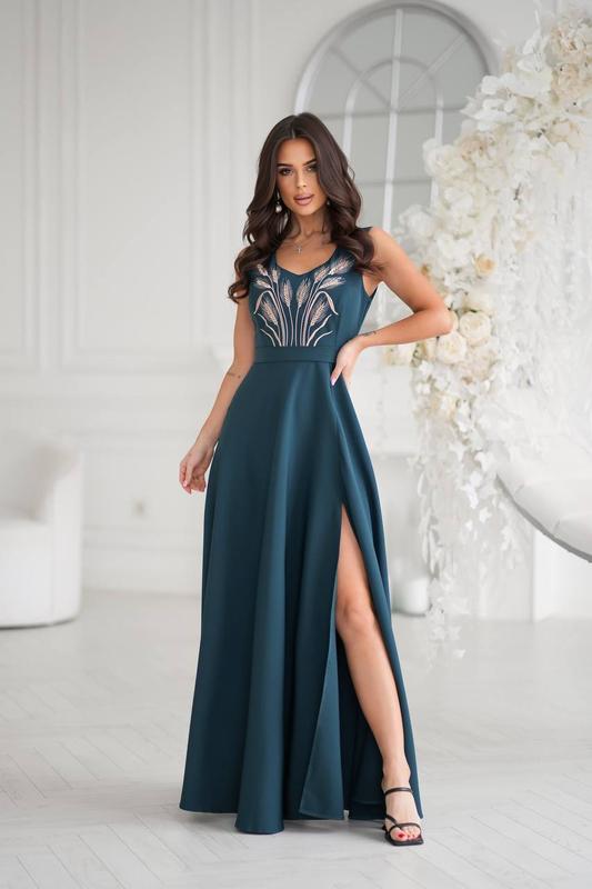 Вечернее длинное платье с элегантной контрастной вышивкой на груди.