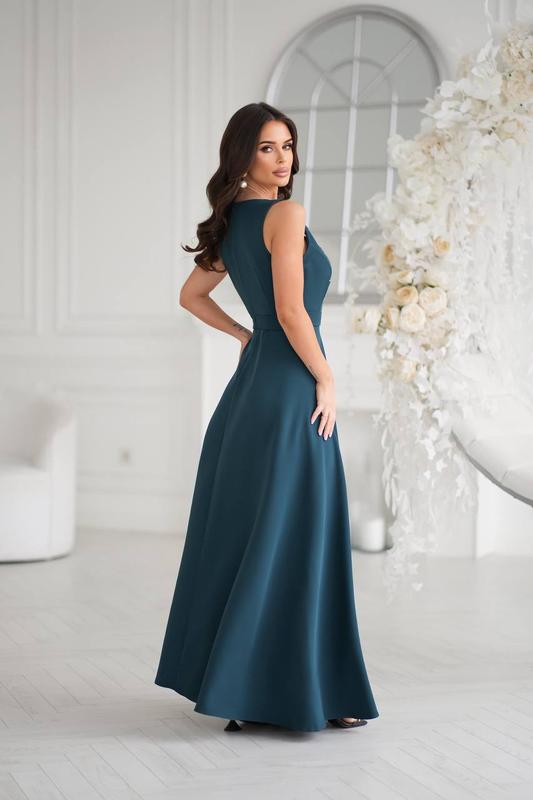 Талия акцентированная вшитым поясом, что делает силуэт женственным и гармоничным. Юбка платья длинная, а высокий разрез на ноге добавляет соблазнительности и утонченности.