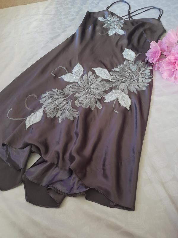 Дуже гарна вечірня сукня pearce fionda, в лавандовому приглушеному колірі , довжина міді , низ ассіметріч , спинка відкрита , фасон дуже жіночний , спокусливий ,гарне плетіння бретелей на спинці, тканина гладка масляніста дуже приємна на дотик, квіти вишиті гладдю