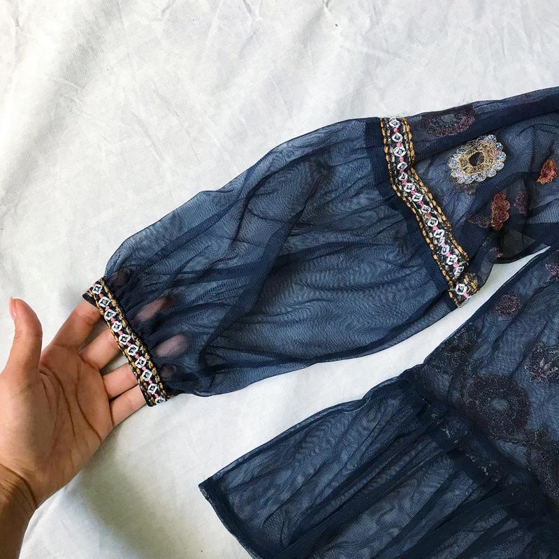 Полупрозрачная синяя пышная шифоновая блуза в цветочный принт с пышными рукавами mango
