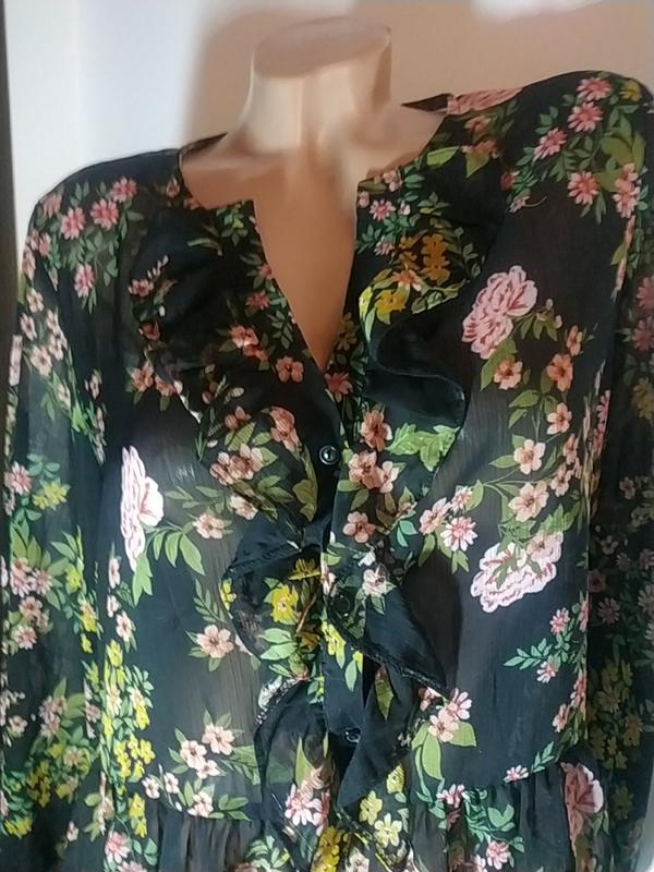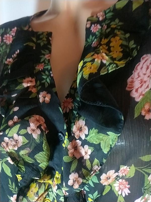 легкая шифоновая прозрачная блузка с цветочным принтом, с баской и рюшами. классная стильная модель