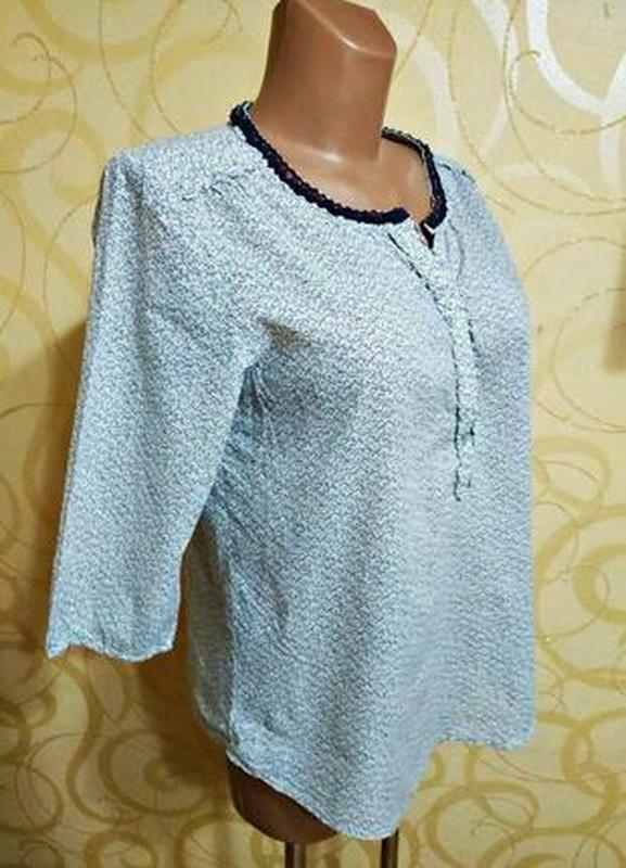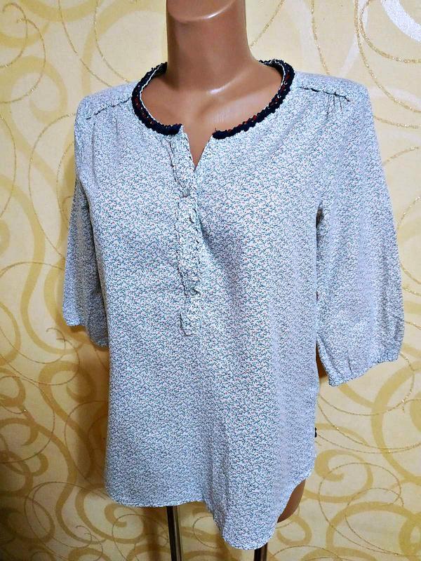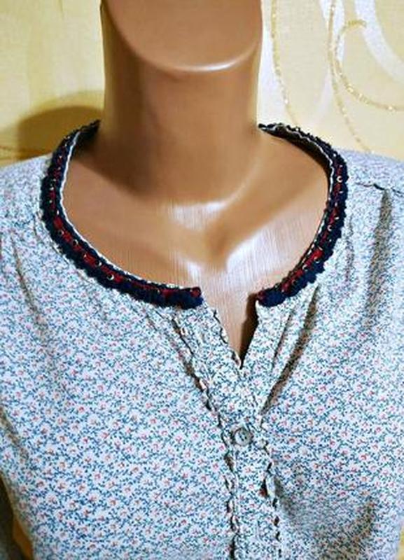 Блузка прямого, свободного силуэта, элегантной длины, с рукавом 1/2.Кругла горловина в тандеме с v-образным вырезом на короткой планке с застежкой на пуговицы с названием бренда.Горловина обработана оригинальным декором.Блузка выполнена из натуральной хлопковой ткани в нежный принт, комфортная и удобная в использовании.Прямый крой скроет недостатки фигуры. Идеальный баланс стиля и комфорта. Отличный повседневный вариант.