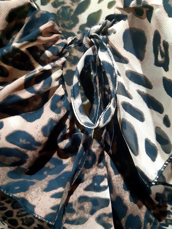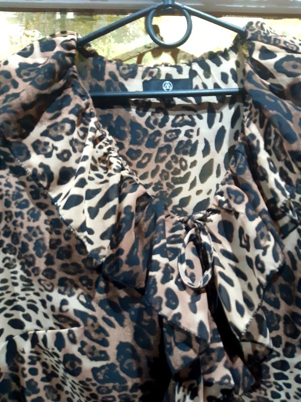 Очень крутящая блузка у трендовый леопринт,с воланами.Стан -идеальное, полномерная, ткань напоминает шифон, но не просвечивает, очень приятна на ощупь.Надевается через голову, застежек -не имеет, в районе декольте, есть веревочка, объем регулируется.Рукав - укороченный. Указан 22 европейский размер.Хорошо будет смотреться на наш 52-54.Замеры🌺🌺🌺-Ширина от подмышки до подмышки 64 см, длина изделия -64 см, длина рукава -44 см, блузка выглядит очень классно, нигде ничего не обтягивает👍👍👍