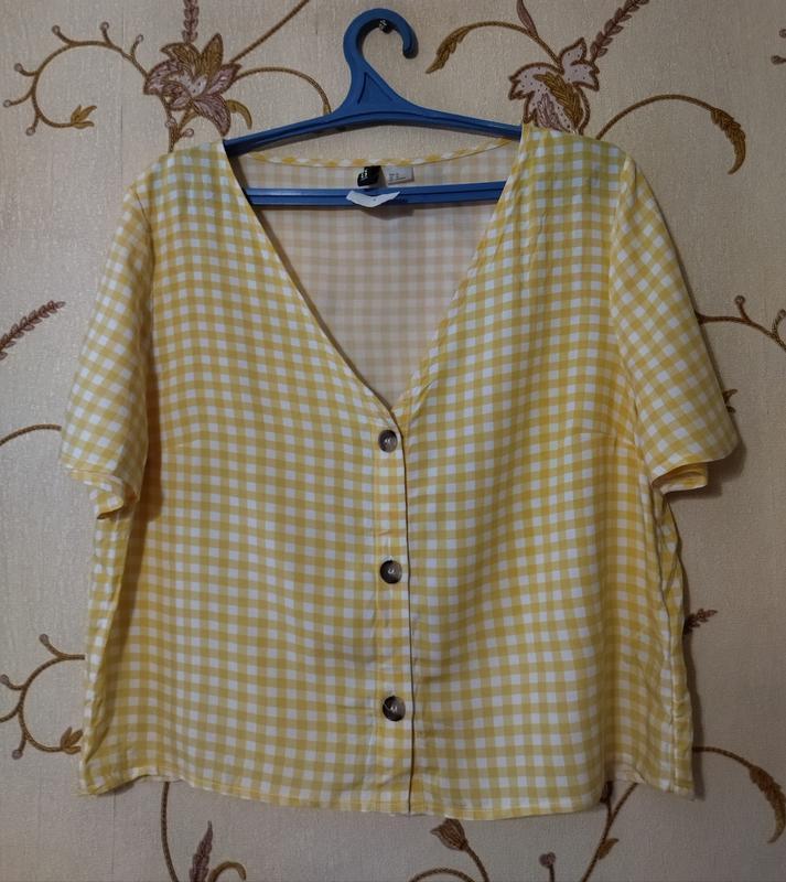 Блуза фирменная с широким V-образным вырезом из вискозы с короткими рукавами и пуговицами спереди. Новая - есть лесочка и остаток от этикетки небольшой. Ткань 100% вискоза. Размер европейский 42 но смотрите на замеры