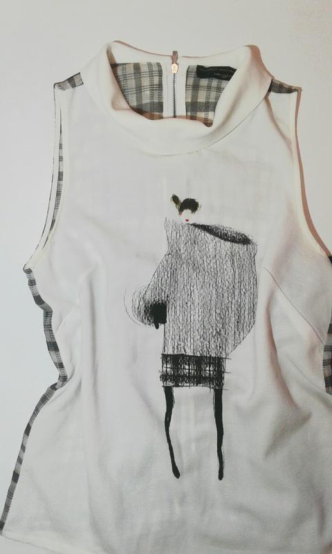 Классная, очень интересная блузочка от ZARA ! Смотрится очень стильно! Впереди белый креп, сзади шифон в клеточку; застегивается сзади на молнию. Состояние новой вещи, без дефектов. Размер М. Длина 59см, пог 45см