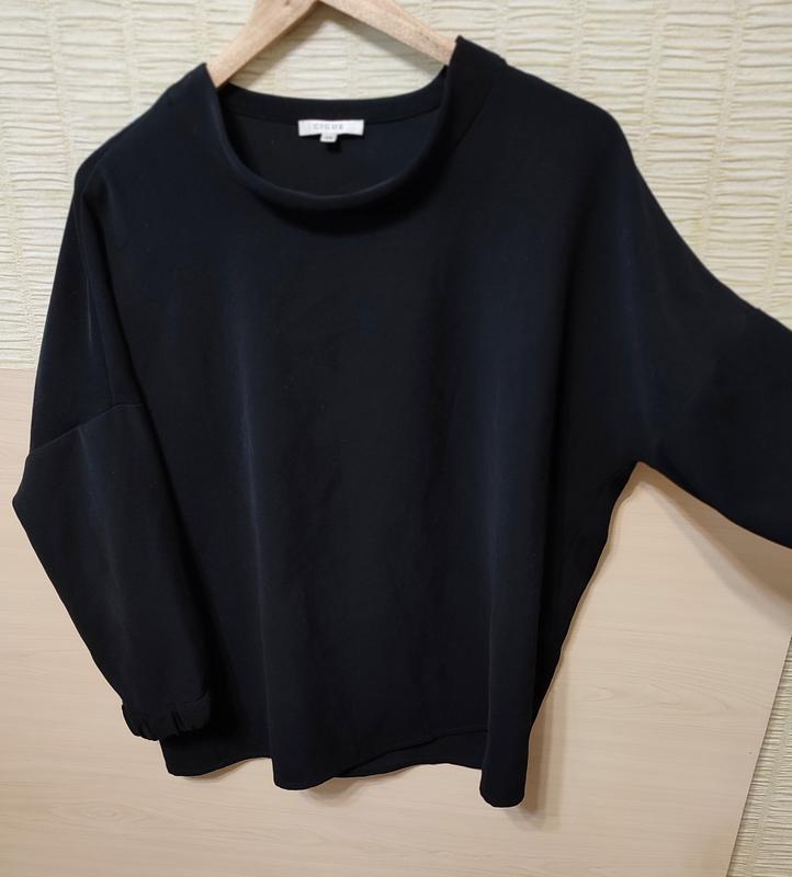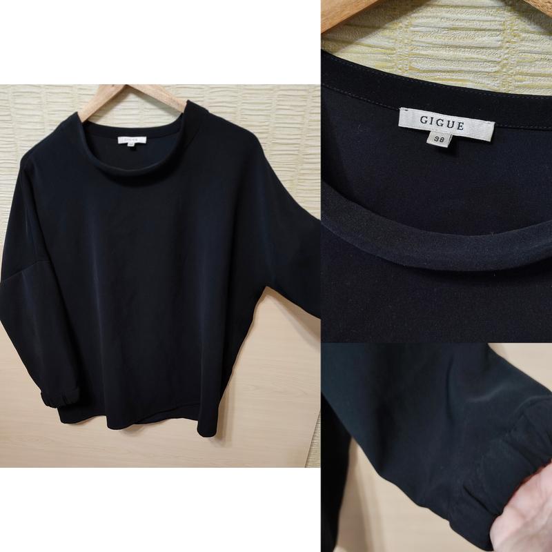 По наборке размер 38, но идет и на больший размер - модель оверсайз. Очень стильная блуза реглан, ткань плотная, тянется, тяжелая на осень-весну. Длина 70 см,