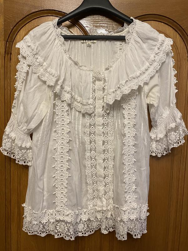 Очень красивая батистовая блуза с кружевом идеальном состоянии ткань тоненая. Натуральная длина 63 рукав от горловины 39, в груди 54