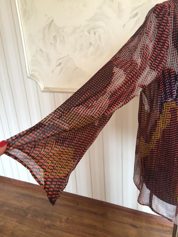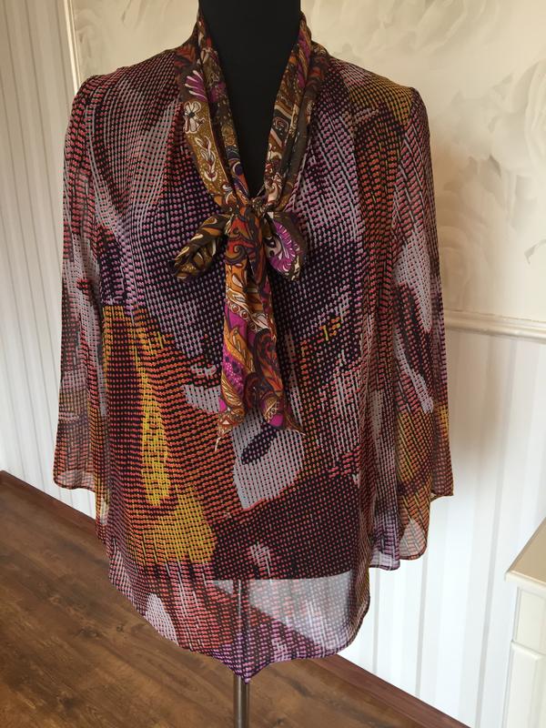 Красивая шифоновая блуза в отличном состоянии.Плечи 41 см, рукав 52 см, ПОГ 56 см, ширина низа 66 см, длина 70 см.