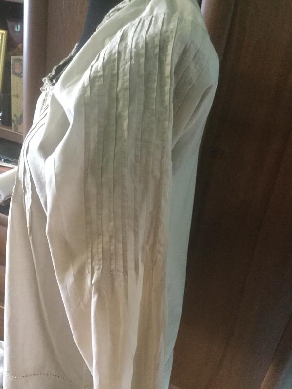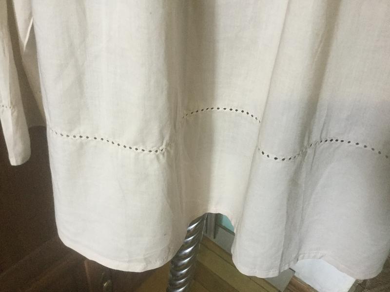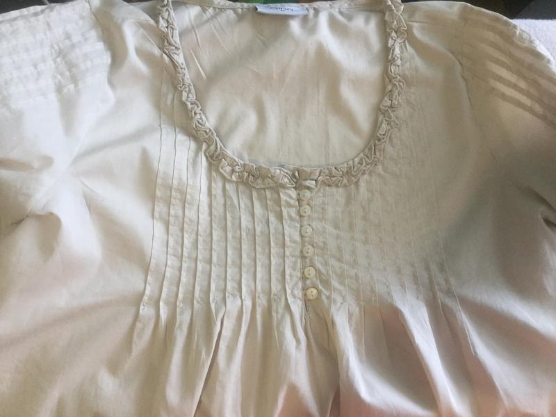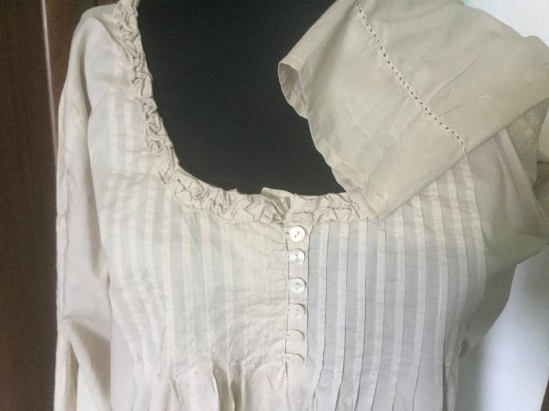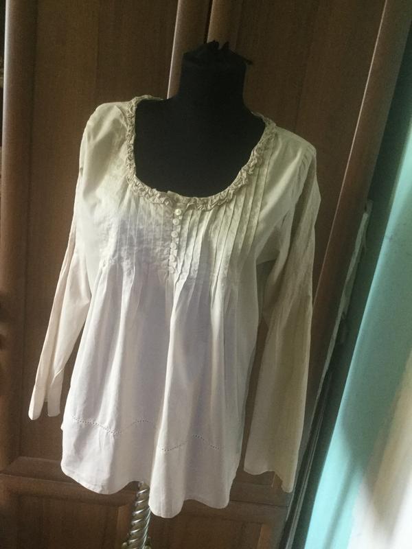 Невесомая вещь, красивая отделка, тончайший батист, единственный изъян-утеряна пуговичка верхняя, фасон разлетайкой,так что может подойти и для беременных, ПОГ 52, рукав доина 62, объем по низу 122.