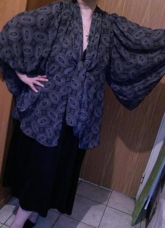Эффектный,женственный,кардиган-разлетайка-болеро,с широким рукавом-типа кимоно,большого размера,оверсайз,NP. Бирка с размером и составом срезана. Одевала на размер 56-58,бёдра 136см, подойдёт и на меньший, и на больший ,вещь свободная-завязывается на "галстучек", скрывает всё,что нужно скрыть. Прекрасно подойдёт на "выход". Мерки снять сложно,но ориентируйтесь по условным замерам,снятым по спинке: длина по спинке 77см, длина рукава 50см,ширина рукава по канту ПО 66см; ПО проймы 43см; ПОГ -от подмышки до подмышки -55см - учитывайте,что пройма большая в связи с кроем рукава; ПОБ,по канту 82см, передняя полочка по канту 45см Очень оригинальная, нестандартная вещь. Девушки,пожалуйста,переспрашивайте,сделаю дополнительные фото,замеры.ВОЗВРАТА НЕТ, объявления платные. См.др.мои объявления-есть аналогичные блузки,пиджаки натуральные, больших размеров. Подписывайтесь на мою страничку-есть ещё очень много "не выставленной" одежды,постоянные обновления одеждой больших размеров. Состав: полиэстр-типа шифона Доставка: Перешлю при полной оплате на карточку Приват
