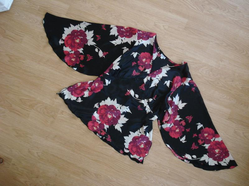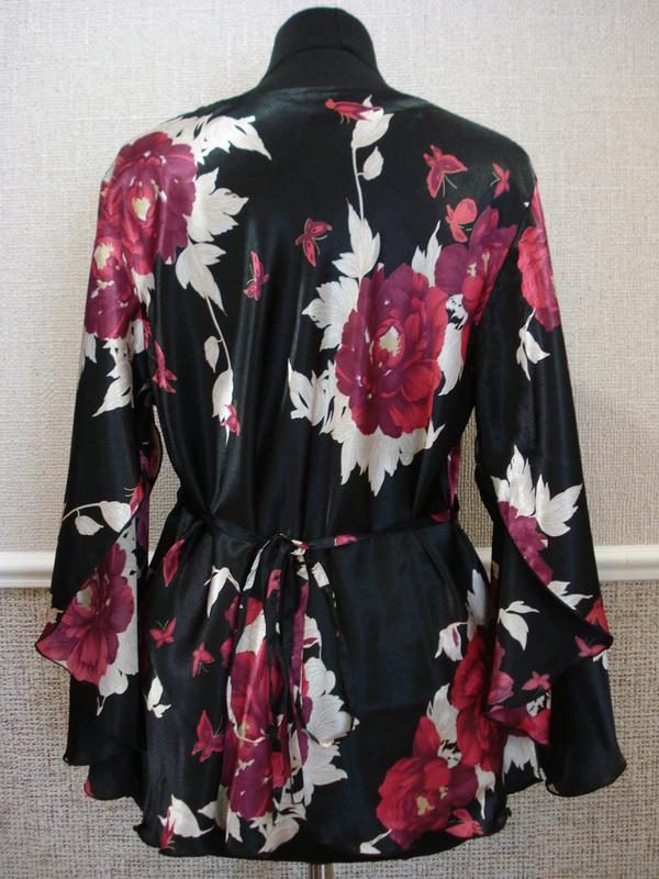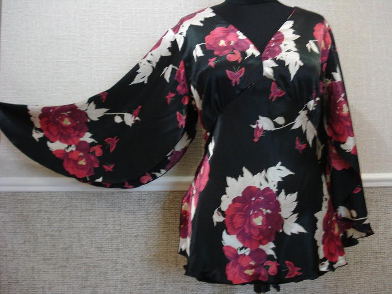 Замеры: плечо - 11,5 см., рукав - 56 см., ширина по линии плеча - 47 см., ПОГ - 63 см.,ПОТ - 58 см.,ПО по низу - 70 см., два боковых разреза внизу блузы - 17 см., длина от линии плеча - 70 см.